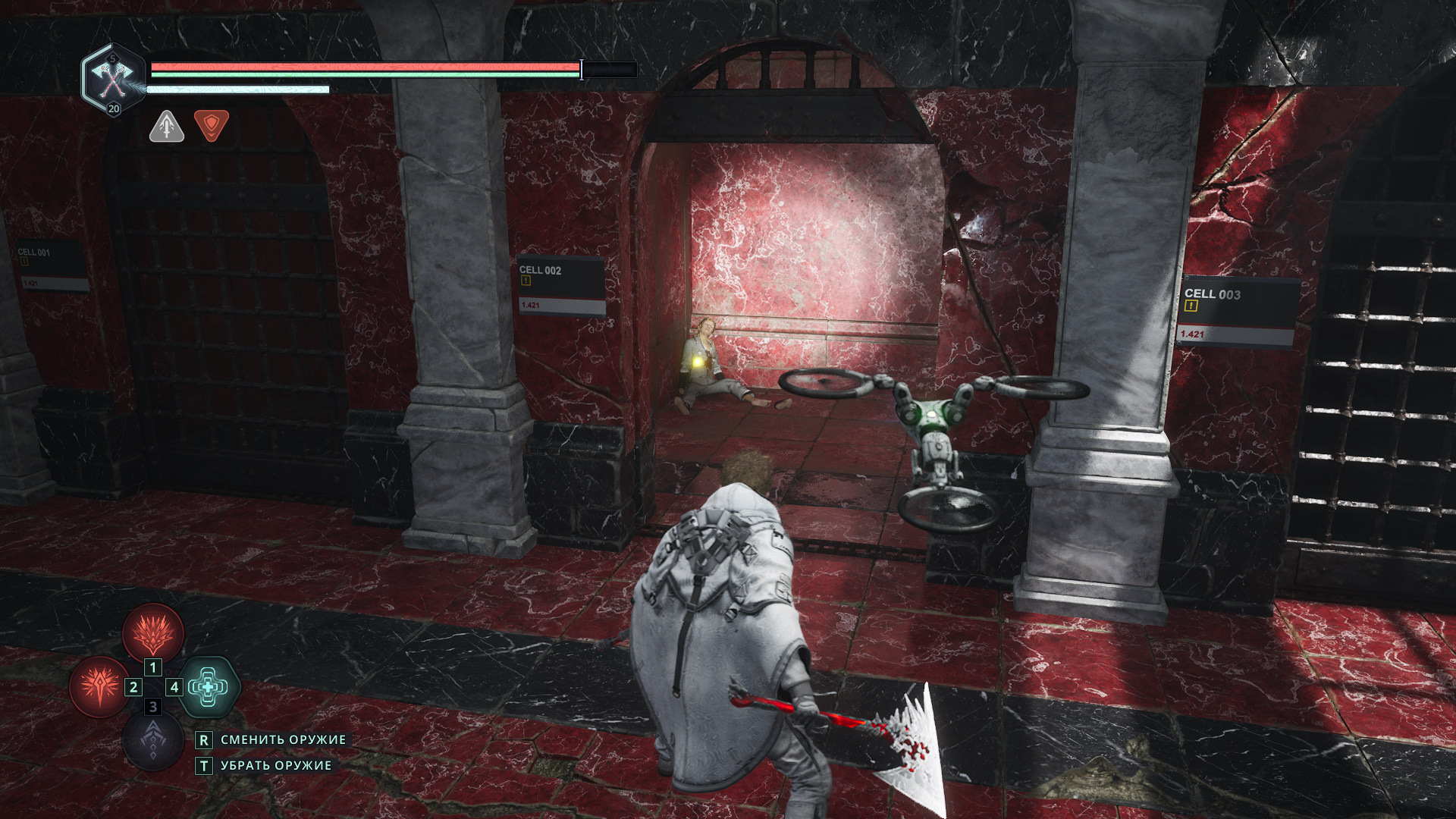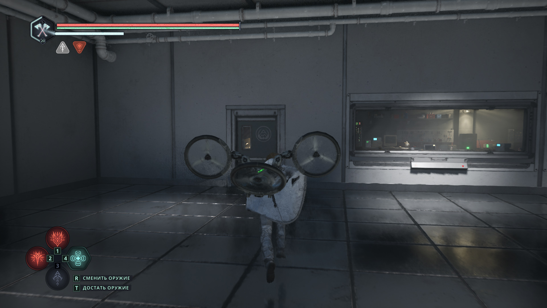 Пройдите в конец коридора в тренировочную зону. Запускайте испытания при помощи подвешенного пульта. По сути, вам нужно убить всех врагов. Когда область будет зачищена, техник откроет дверь. Но вы найдите другую дверь в одной из камер (крайней слева), чтобы попасть в красный коридор. Подберите с трупа самодельный перстень. В соседней камере ищите портсигар.