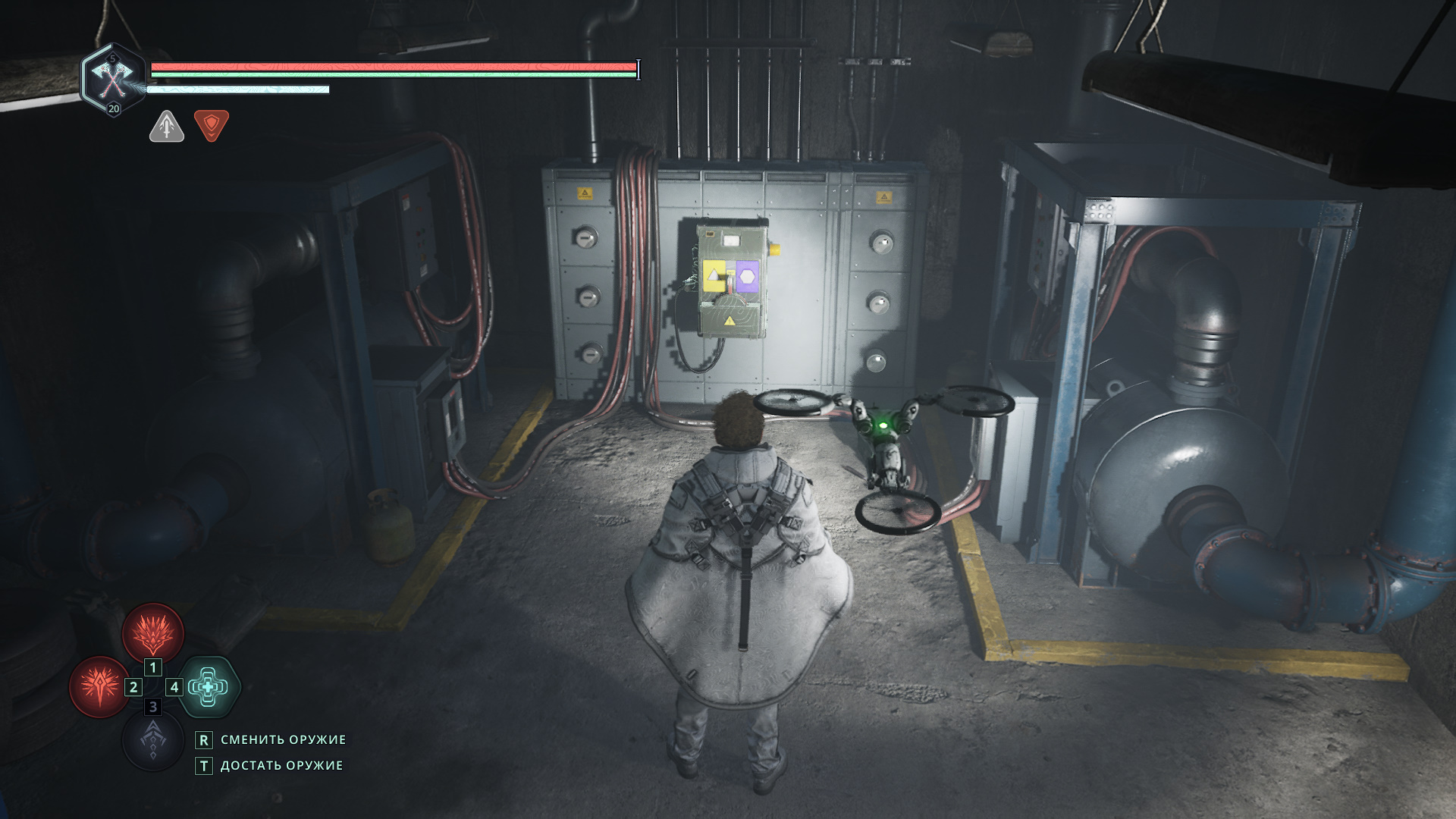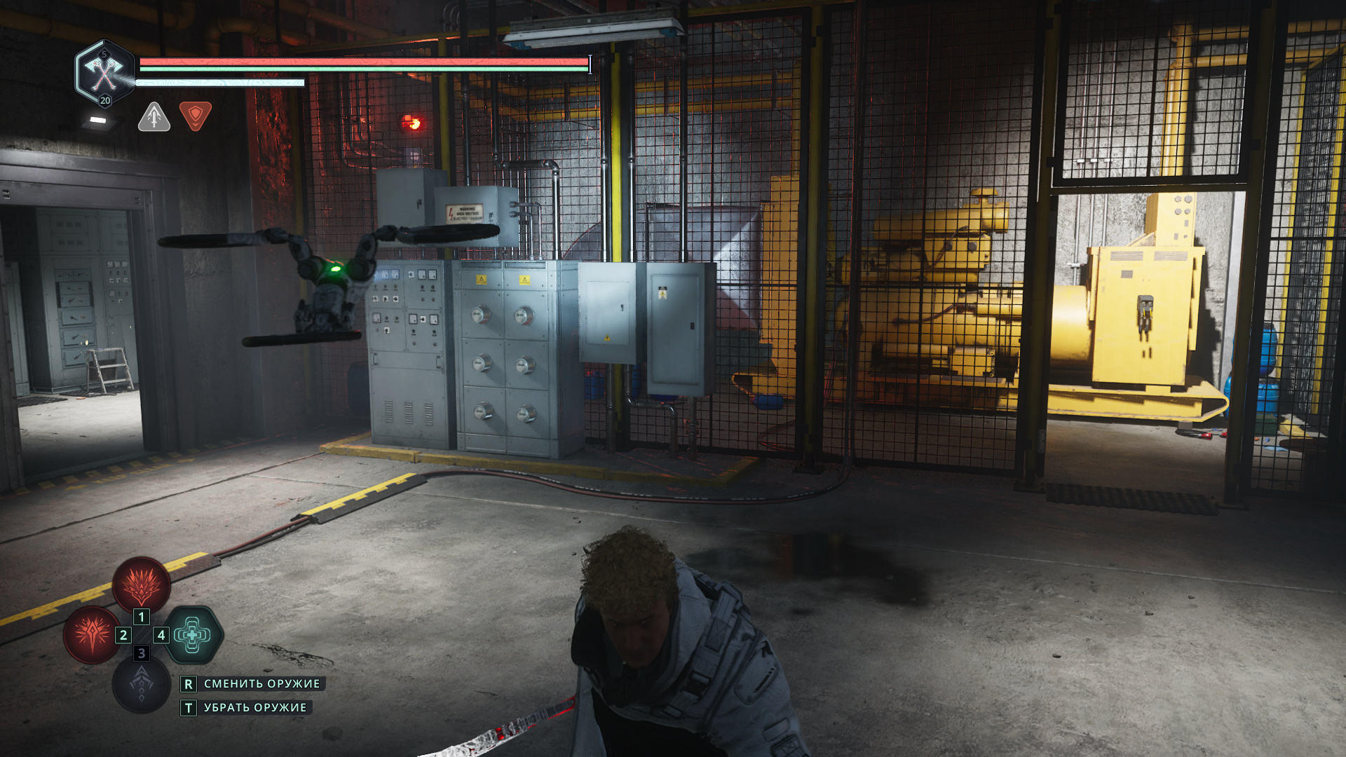 Вернитесь на B1, чтобы помочь технику в беде. Откройте дверь ключом «Обслуживание» и включите фиолетовую сеть.