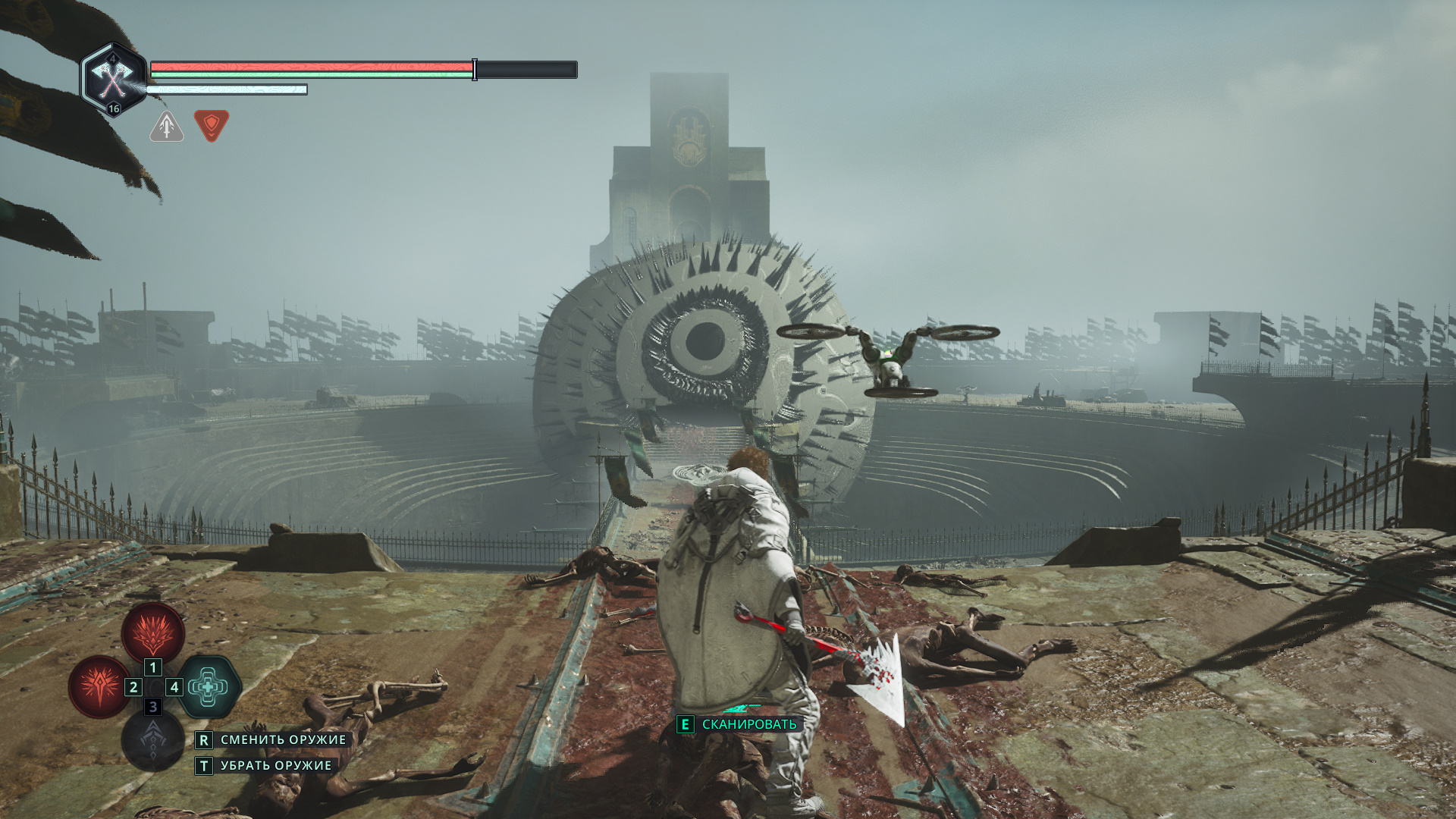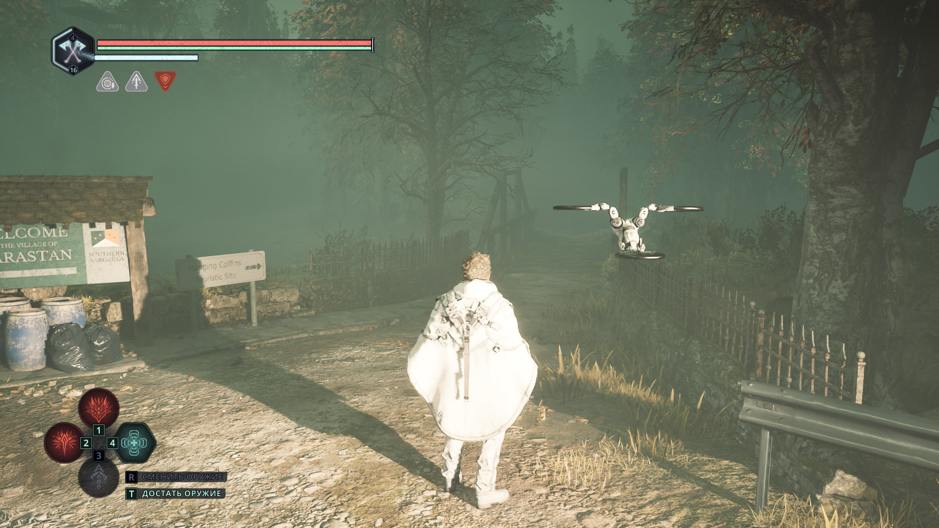 Чуть дальше стоит Страж временной петли. Чуть дальше есть дыра в заборе. Пройдите через нее, чтобы попасть на улицы города. Убив монстра, посмотрите вправо и найдите спуск к трупу с бюллетенем (предмет для исследования).
