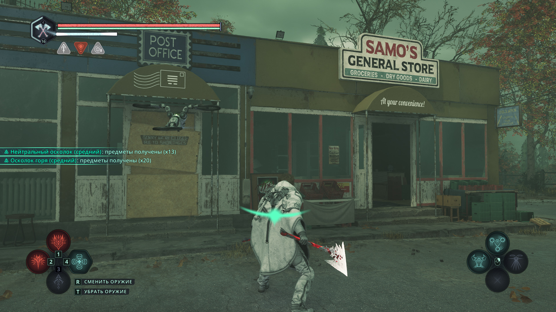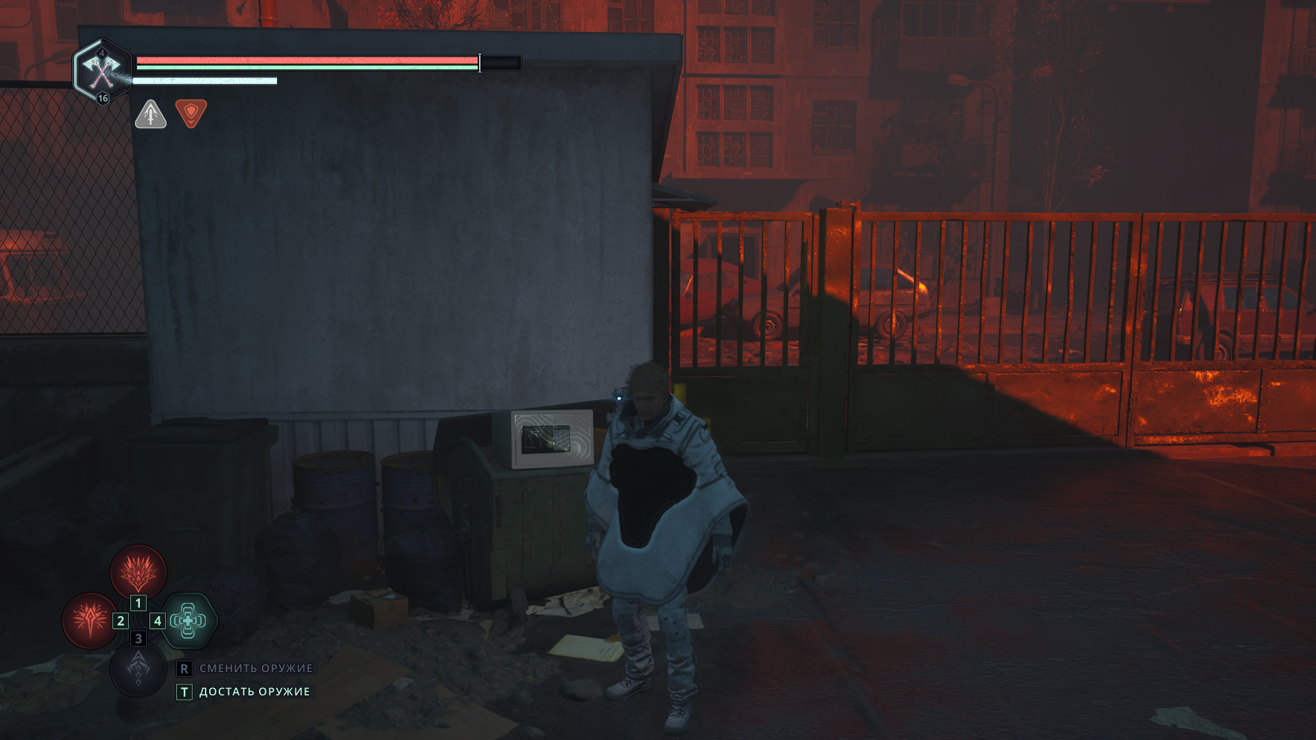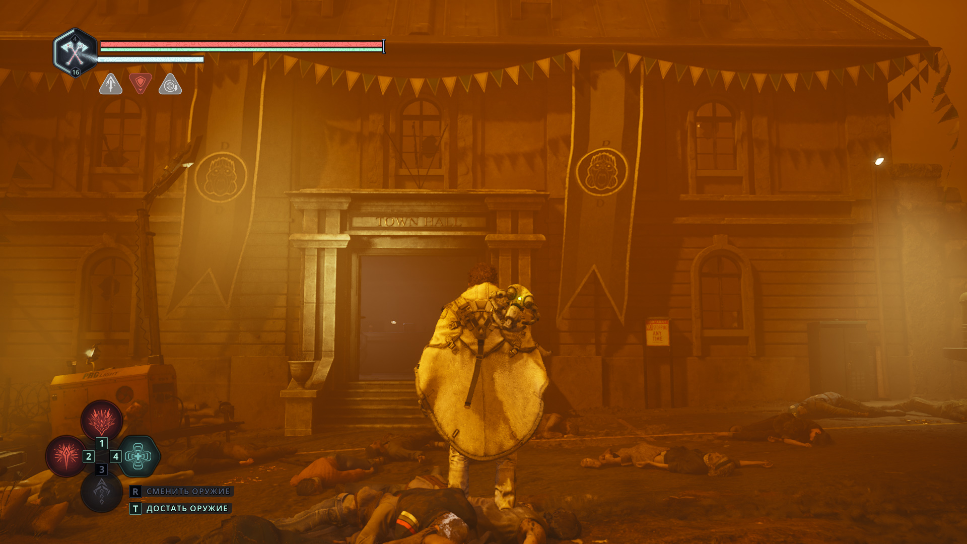 Обойдите аптеку по левой стороне, пройдите мимо нее, убейте монстра около входа в мэрию. Этот боковой вход мэрии открыт, поэтому вы можете пройти внутрь. Рядом с входом лежит желтый предмет — 4 сигнальные шашки. Так начнется благое дело «Свет во тьме (1)».
