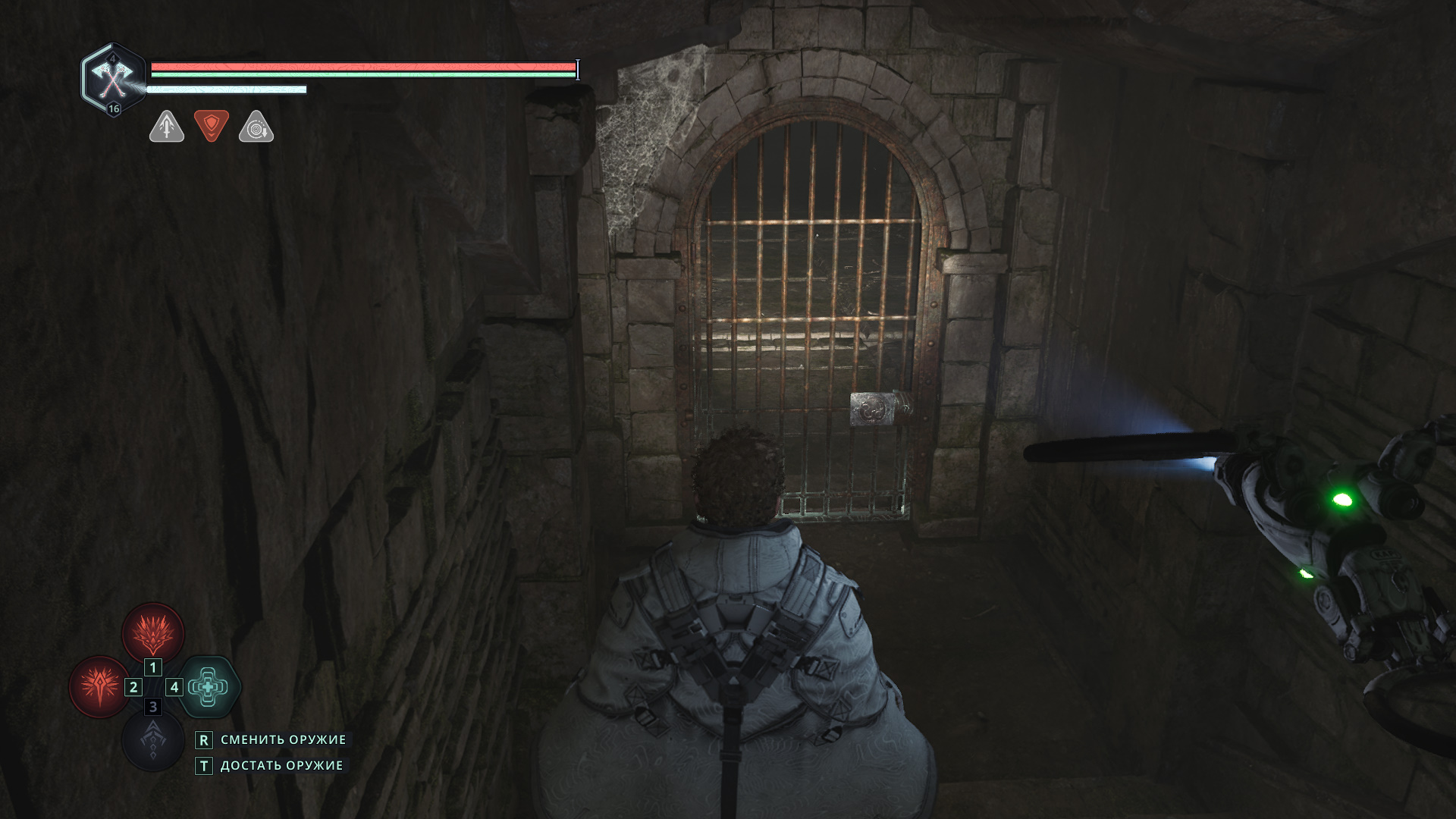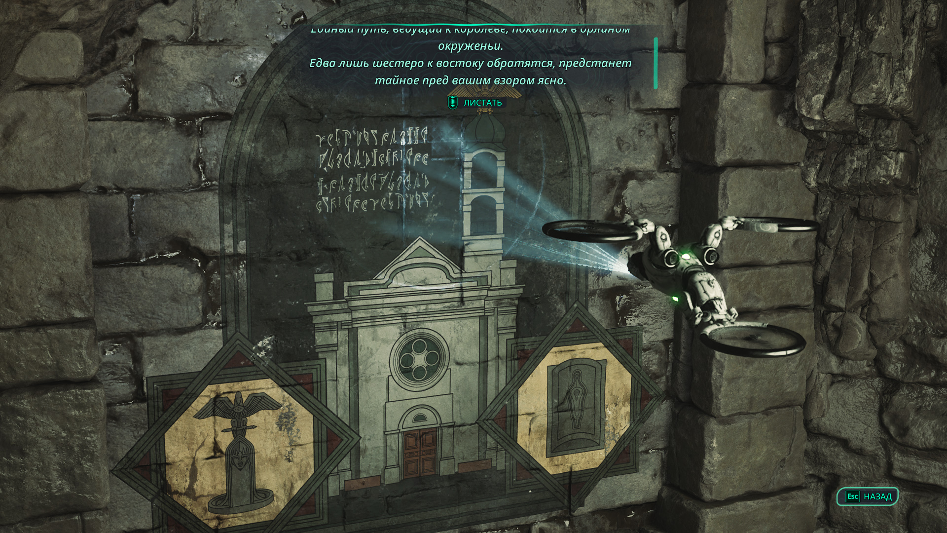 Вы же пойдите вправо и спуститесь по выступам к месту, где встретили настоятеля Браманте и солдат. Окажетесь за решеткой, которая открывается с этой стороны, около антенны. Примените ключ от антенны и потяните за рычаг, чтобы отключить радиосообщения и совершить благое дело.