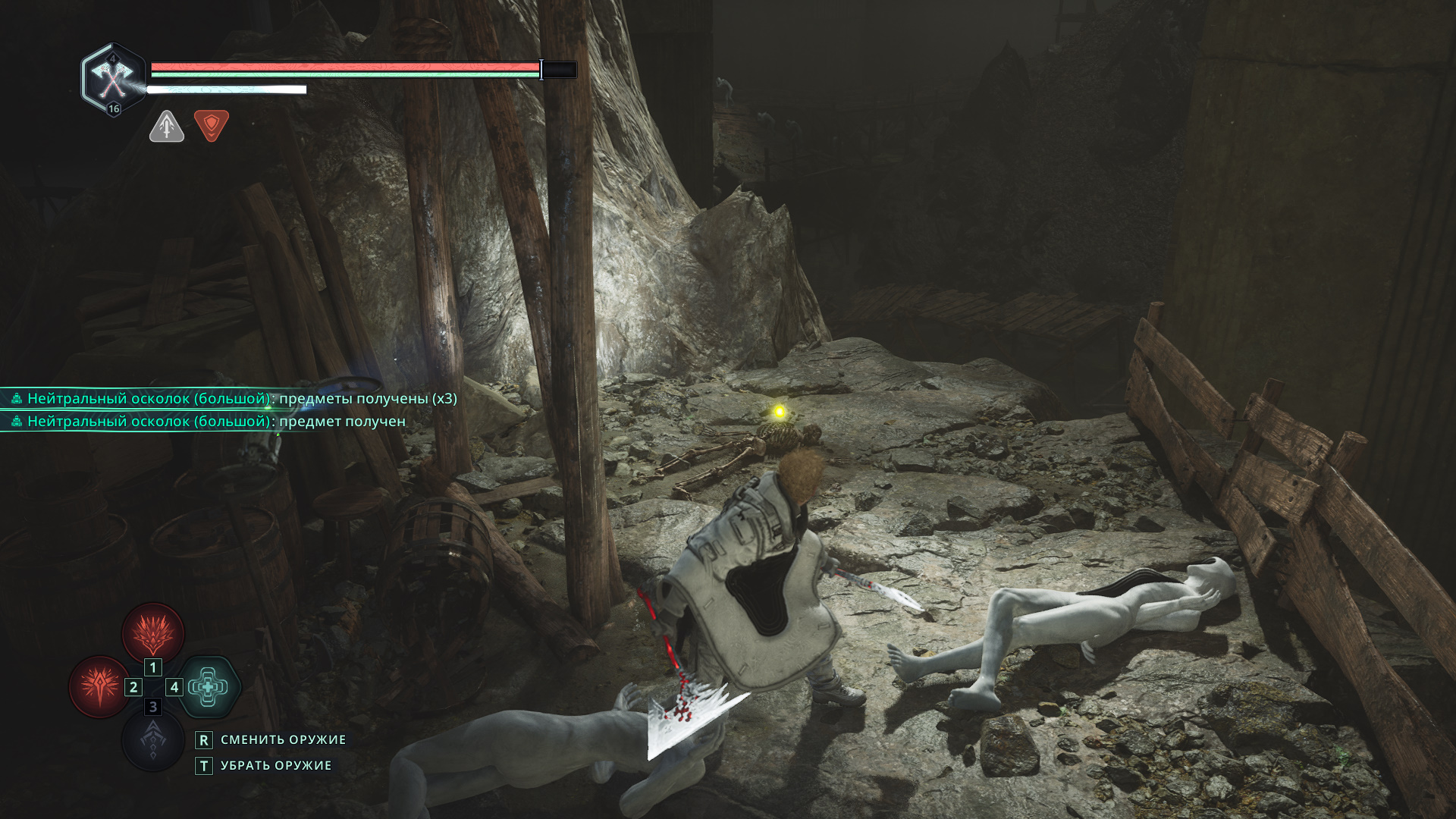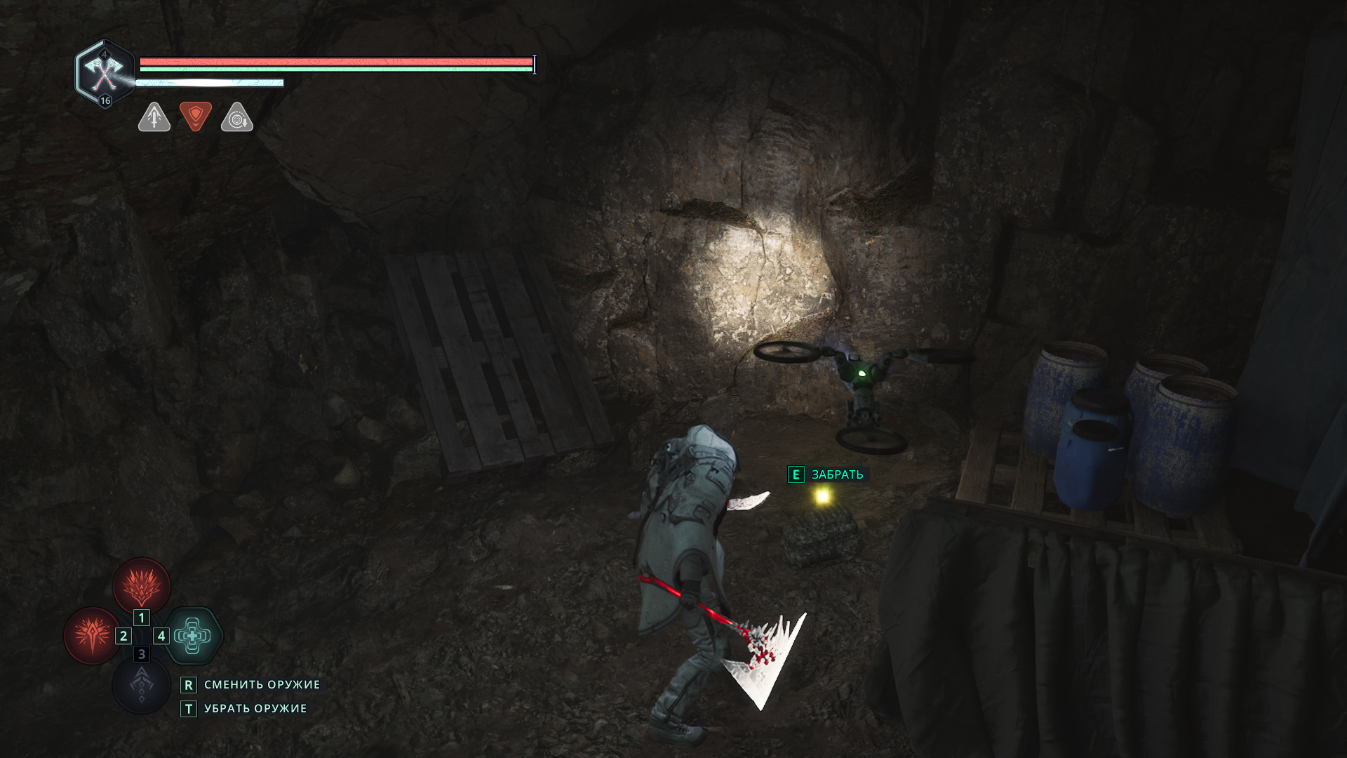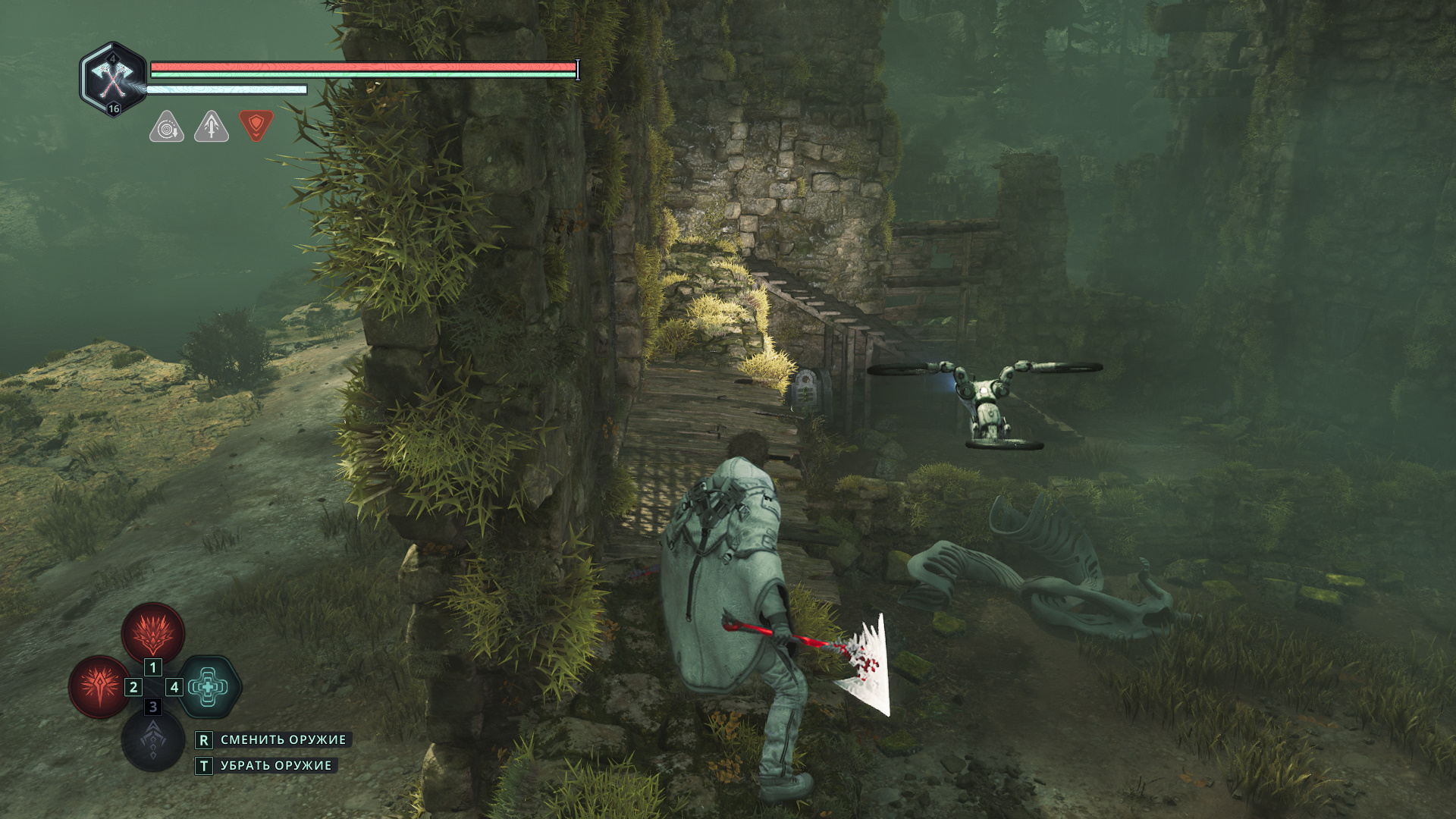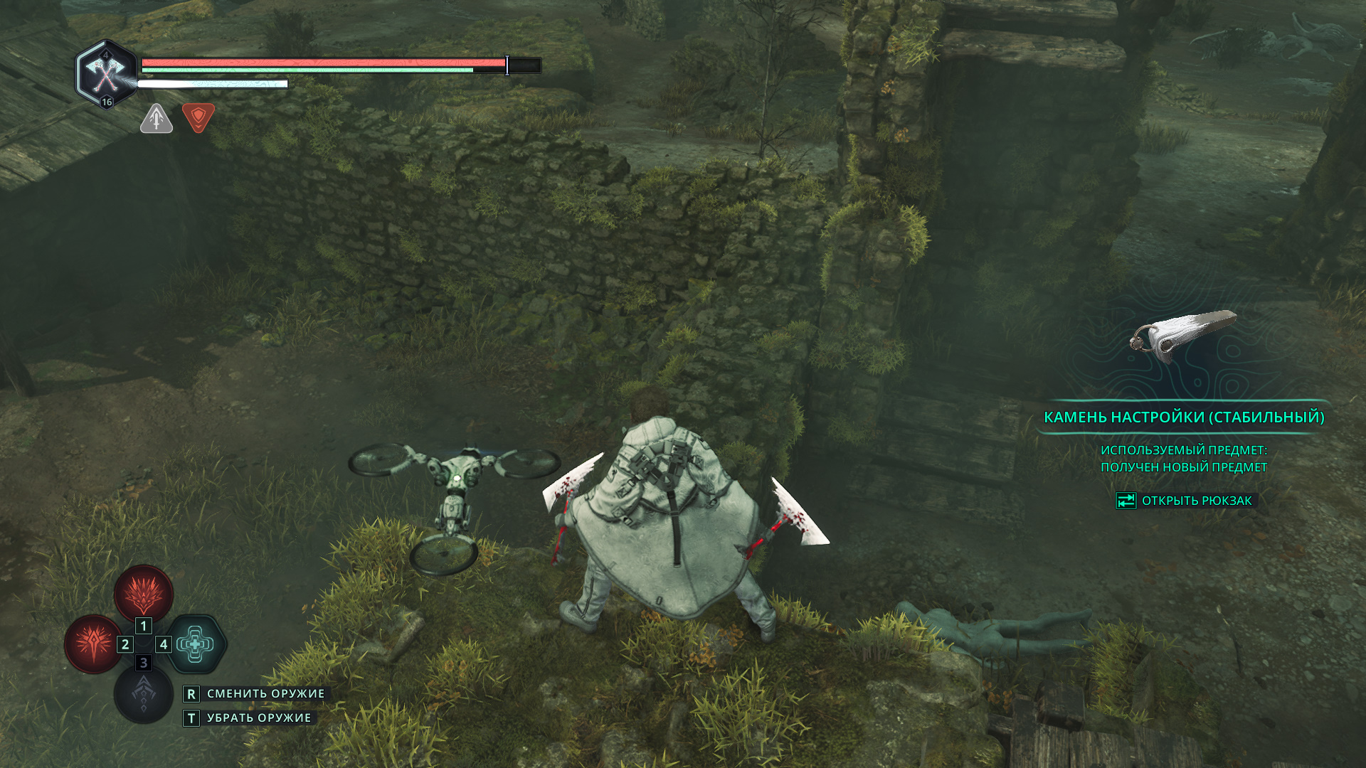 Вернитесь к лестницам и спуститесь на самый низ. Двигайтесь вперед мимо строительных лесов, убивая врагов. Найдите справа деревянную лестницу, ведущую на вершину лесов. Поднимитесь, перейдите по доскам и двигайтесь вдоль стены вправо. Враг охраняет сундук, который открывается тем самым ржавым ключом. Так вы раскроете тайну. В сундуке спрятаны 5 стабильных камней настройки.