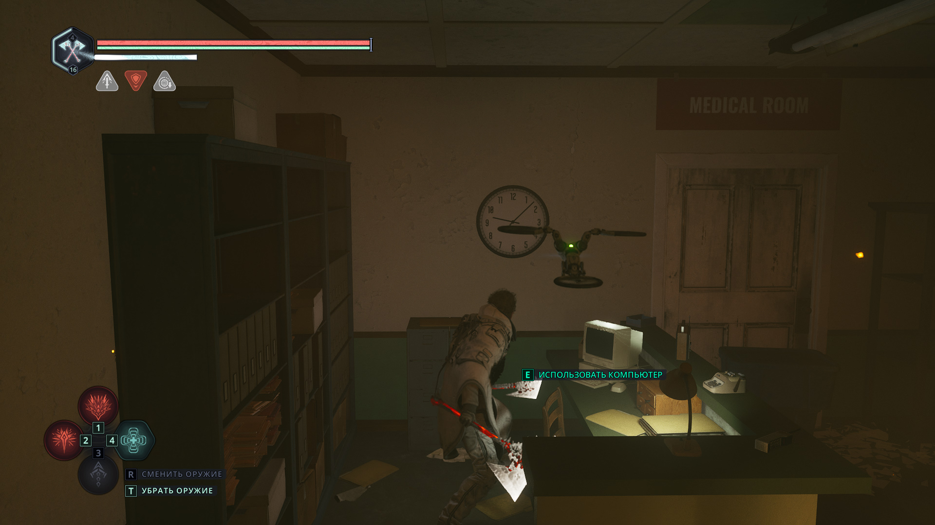 Внутри аптеки есть компьютер с кодом. Если прочитаете найденный на железнодорожном мосту Талджу дневник «Безумная неделя», узнаете, что пароль можно найти на часах в аптеке. Посмотрите на настенные часы. Код состоит из 5 цифр. Часовая стрелка находится между 9 и 10, а малая — 1 и 2.