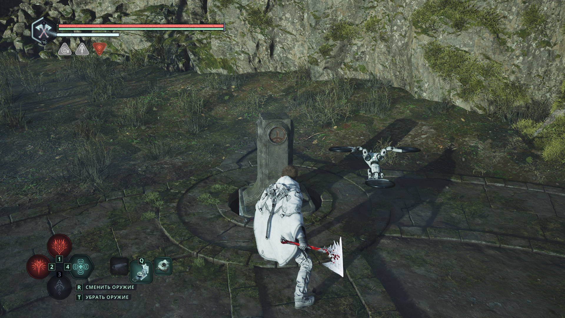 Идите вдоль горы вправо от дома Отшельника, чтобы обнаружить двух врагов, охраняющих четыре каменных шпиля с символами с фотографии. Повернитесь лицом к восточной колонне со «стрелой» (используйте компас). Двигаясь по часовой стрелке, настройте символы следующим образом:
