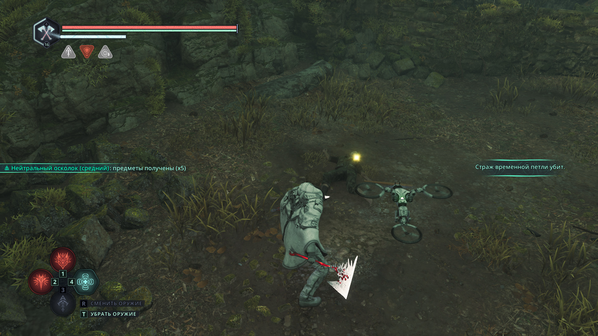 Вернитесь обратно наверх и идите вправо. На этот раз не сворачивайте. Убейте врагов у здания впереди, за воротами. Это Страж временной петли.