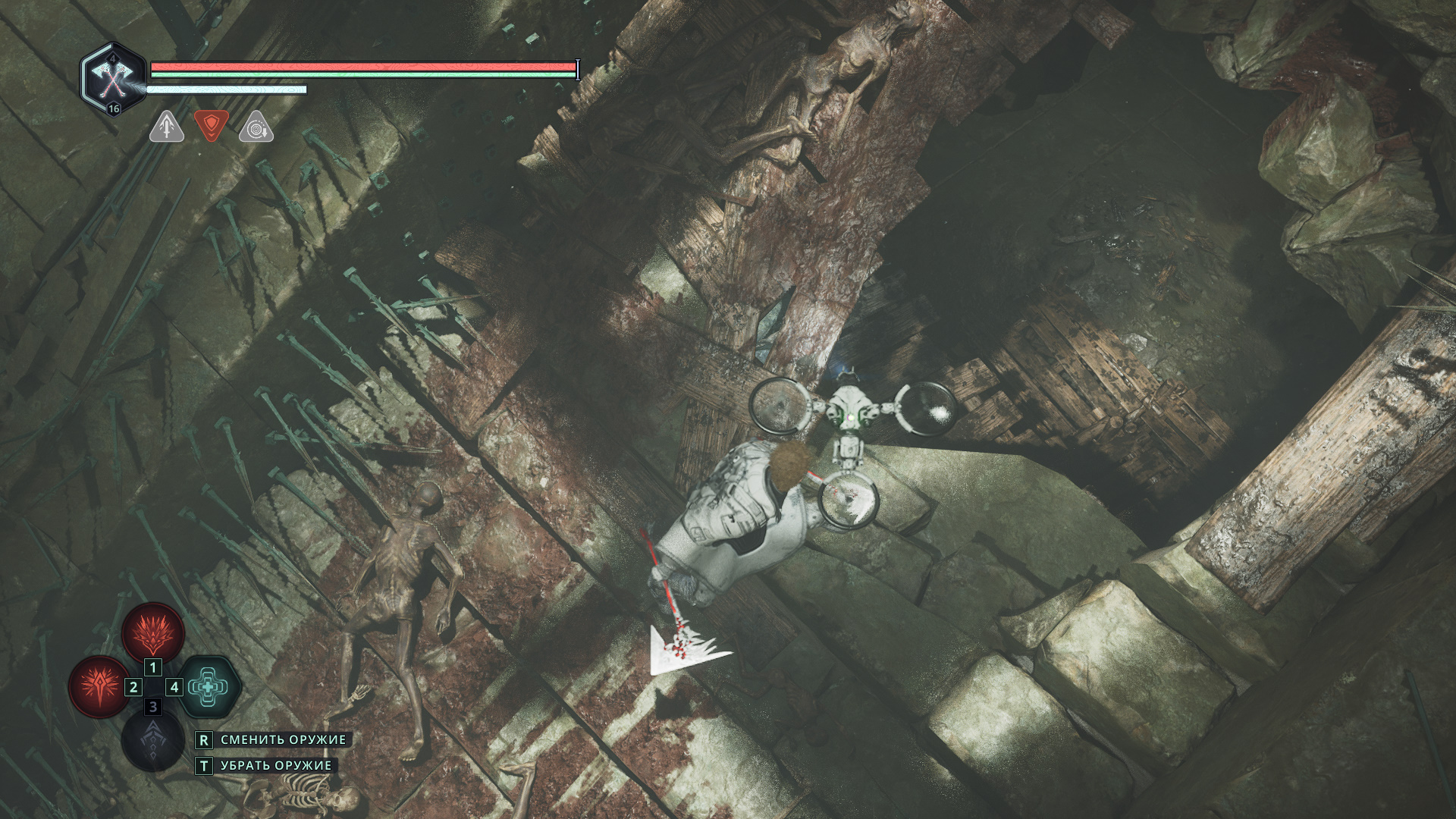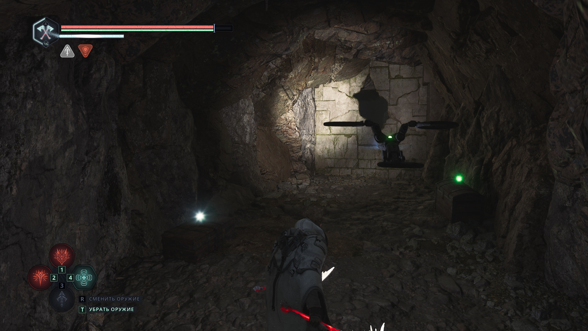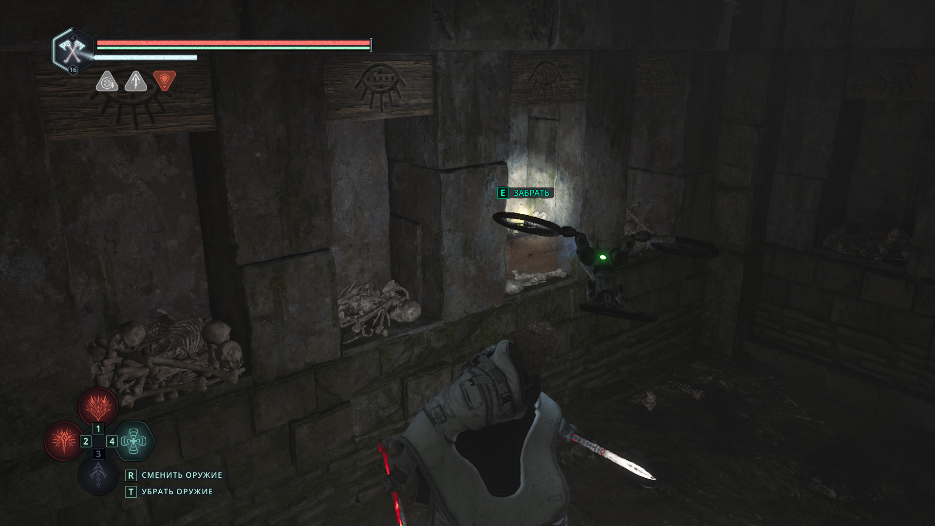 Соберите добычу в склепе: защитное снаряжение «Браслет горя (депрессия) — получив смертельный удар, вы не умираете, а восстанавливаете здоровье, деревянная фигурка лошади (предмет для исследования). Прочтите послание на стене: «Мне было велено ударить эту стену 50 раз».