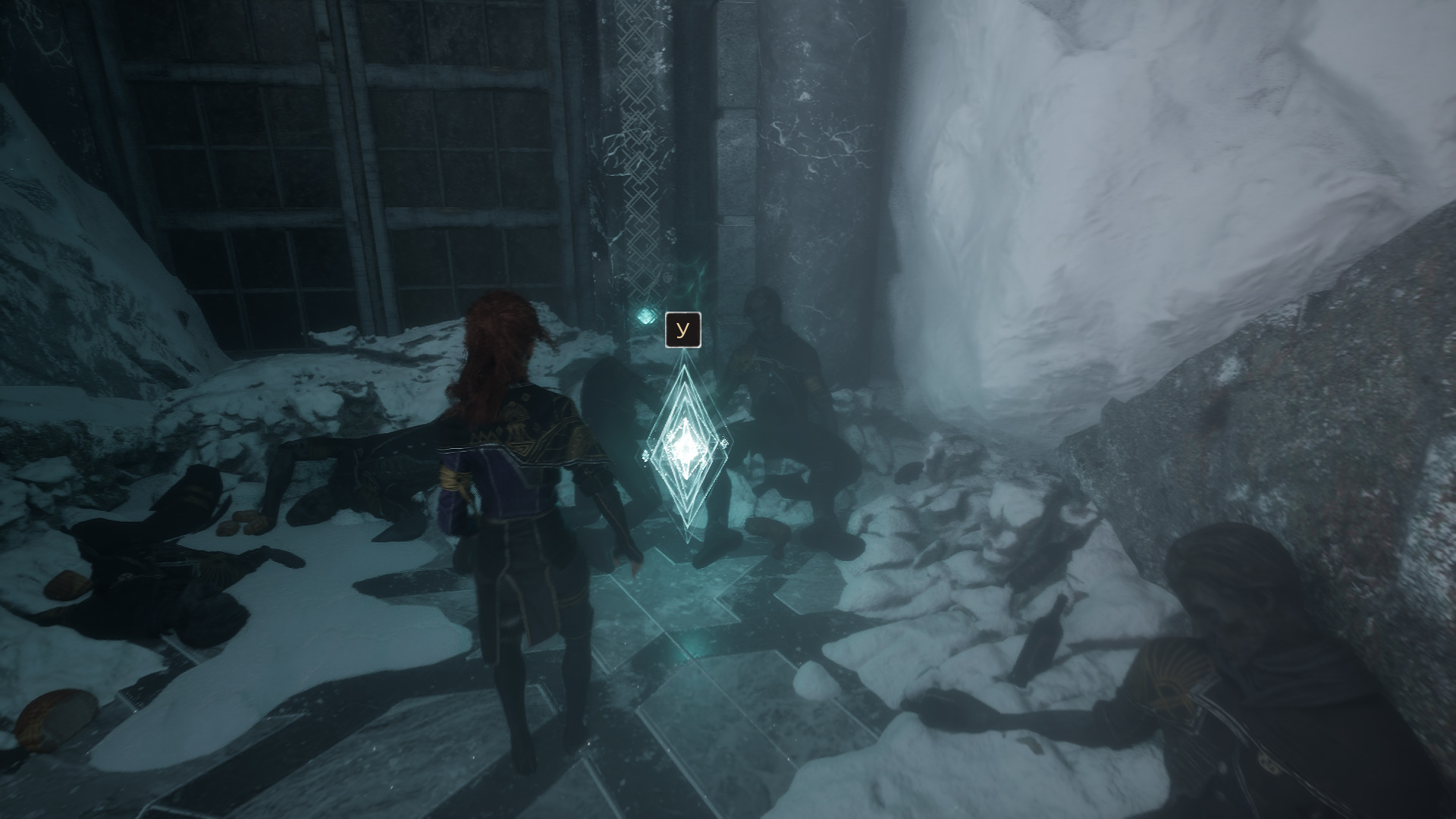 Двигайтесь влево и в здании ищите ~14 000 хромы. Идите дальше по тропе и слева будет пещера с веревкой. Поднимитесь по веревке и увидите впереди второй флаг. Активируйте и идите вдоль горы вправо. Перепрыгните на другую сторону, притянувшись крюком, и спуститесь по веревке. Область патрулирует большой враг, но здесь же есть дверь особняка.