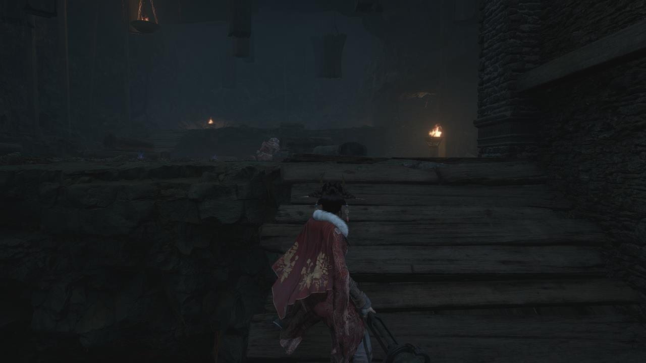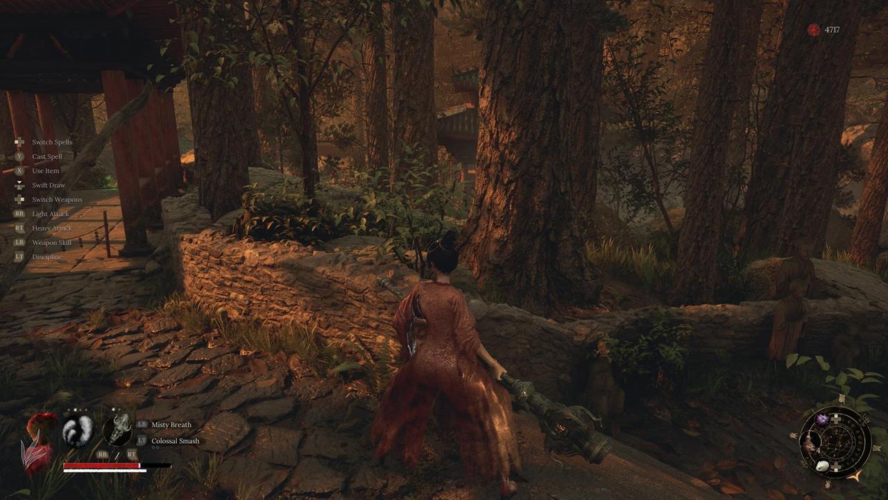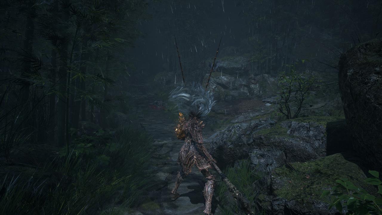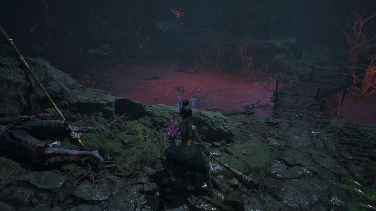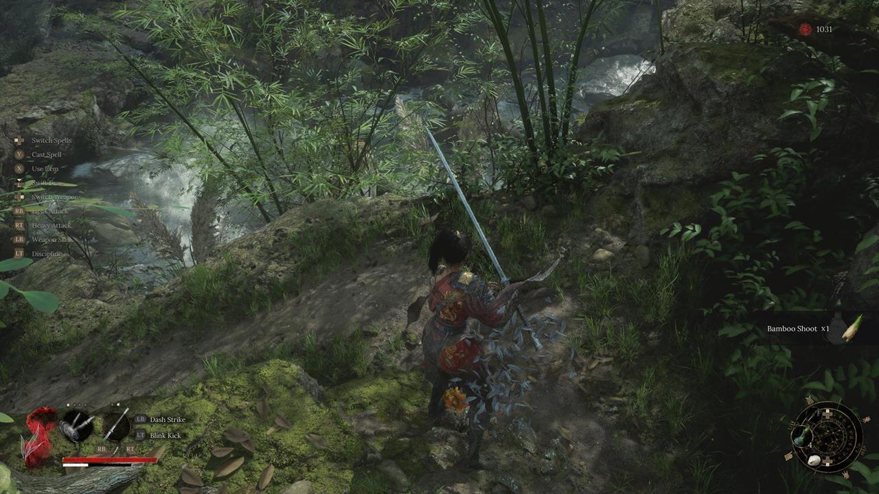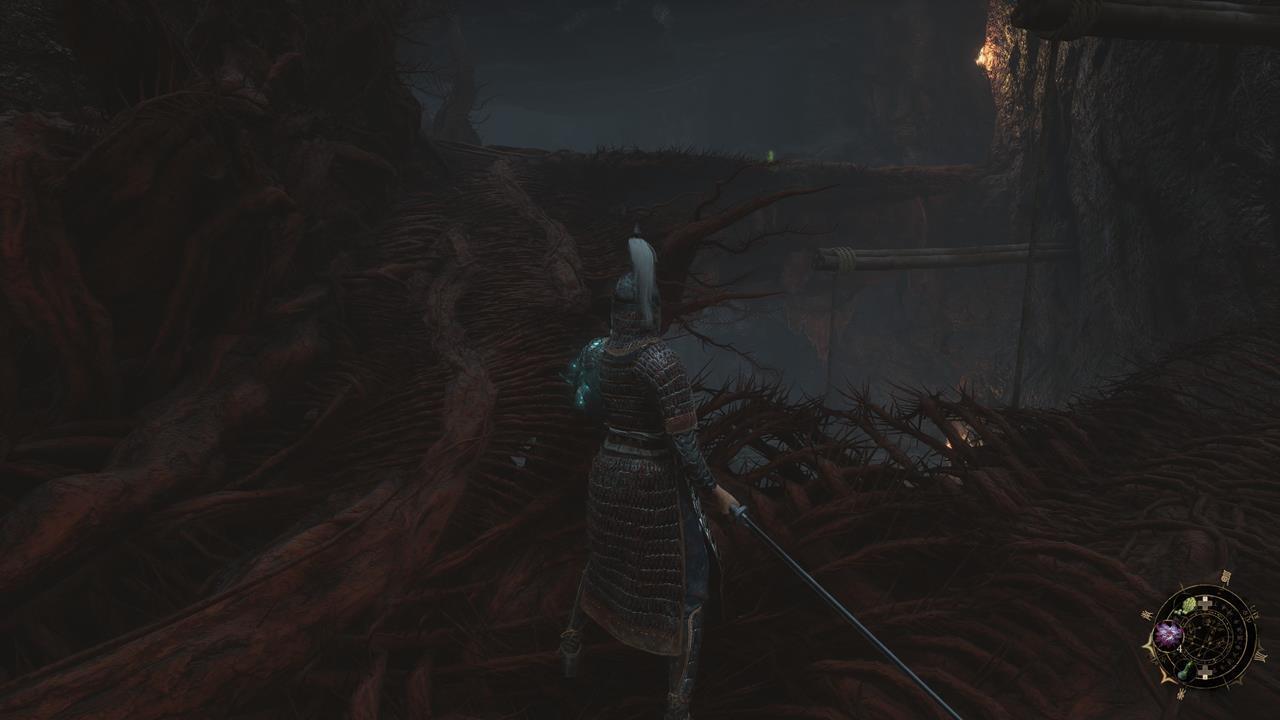 Встав спиной к святилищу, идите по тропе впереди. Вы наткнетесь на большую лужу крови. От нее двигайтесь через ущелье с другими лужами слева. Пройдите мимо ожившего дерева и вскарабкайтесь по лестнице. Ударьте колонну, чтобы создать переправу на другую сторону к Даме в красном. Пройдите по склону вниз от нее, на развилке поверните направо. В тупике прячется бамбуковый монстр.