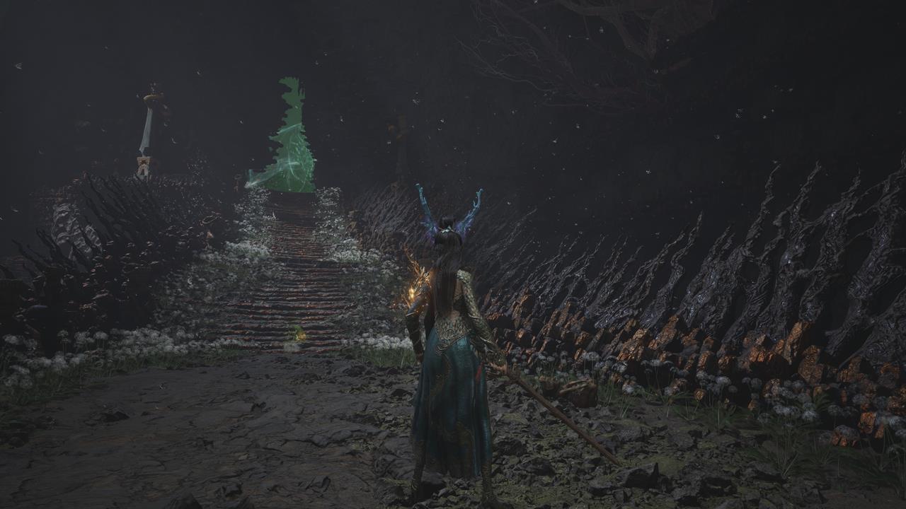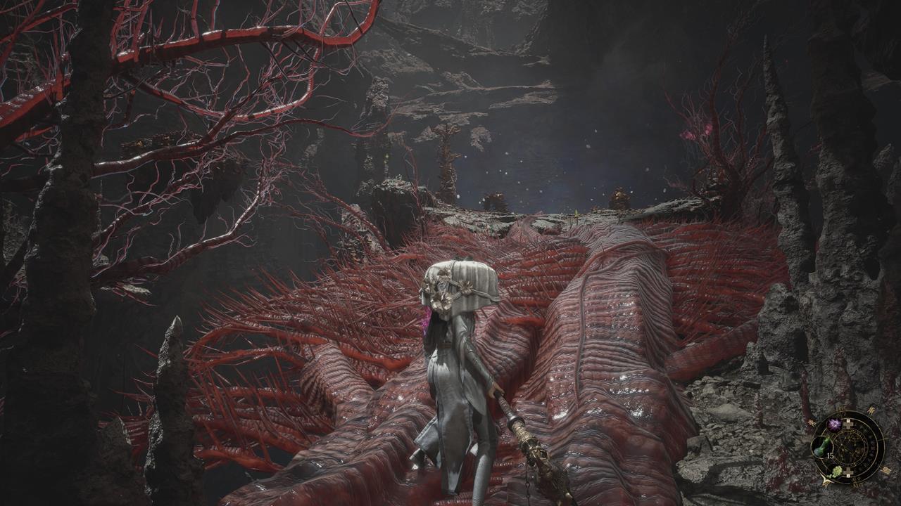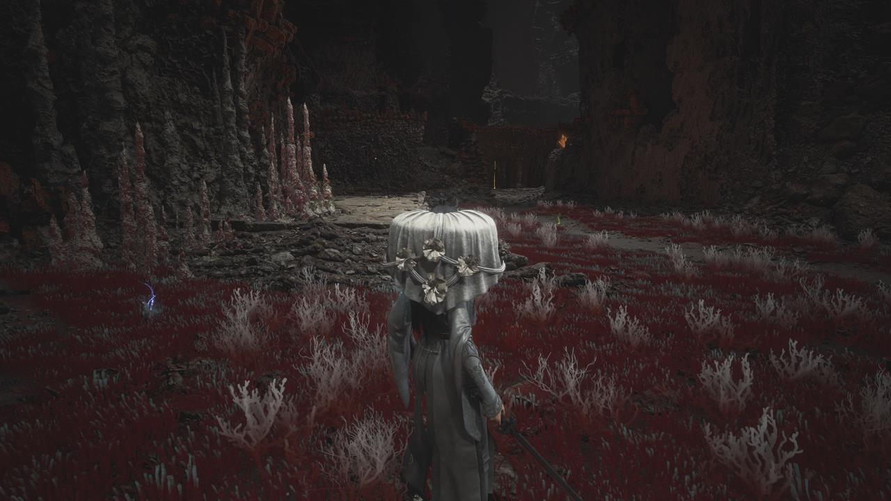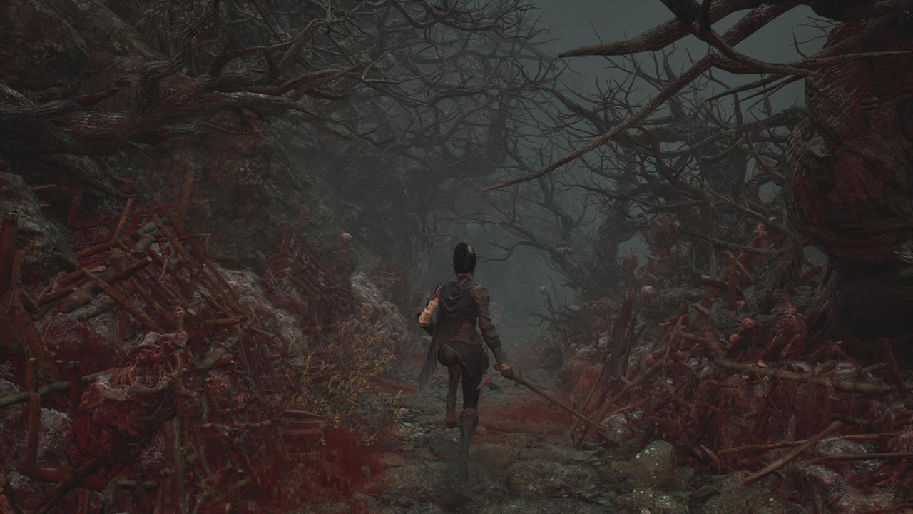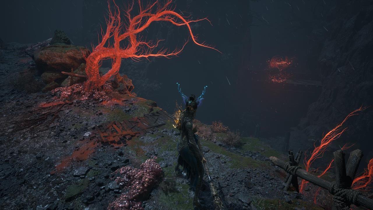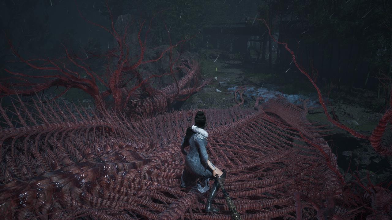 Встав спиной к святилищу, идите по тропе впереди. Вы наткнетесь на большую лужу крови. От нее двигайтесь через ущелье с другими лужами слева. Пройдите мимо ожившего дерева и вскарабкайтесь по лестнице. Ударьте колонну, чтобы создать переправу на другую сторону к Даме в красном. Пройдите по склону вниз от нее, на развилке поверните направо. В тупике прячется бамбуковый монстр.