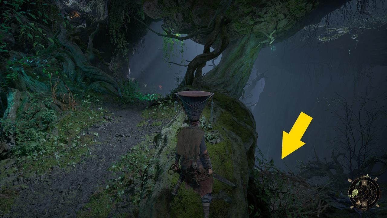 После области со статусом отчаяния (убивающий дебафф), вы пройдете через деревню на деревьях. Там будет лестница, образующая короткий путь назад. Не обращайте на нее внимание и идите дальше. Поднимитесь по другой лестнице внутри полого дерева. Вверху обнаружите испуганных людей. Слева — мост, за которым стоит бамбуковый монстр. Справа — дерево, образующее короткий путь к святилищу «Птичье Жилище».