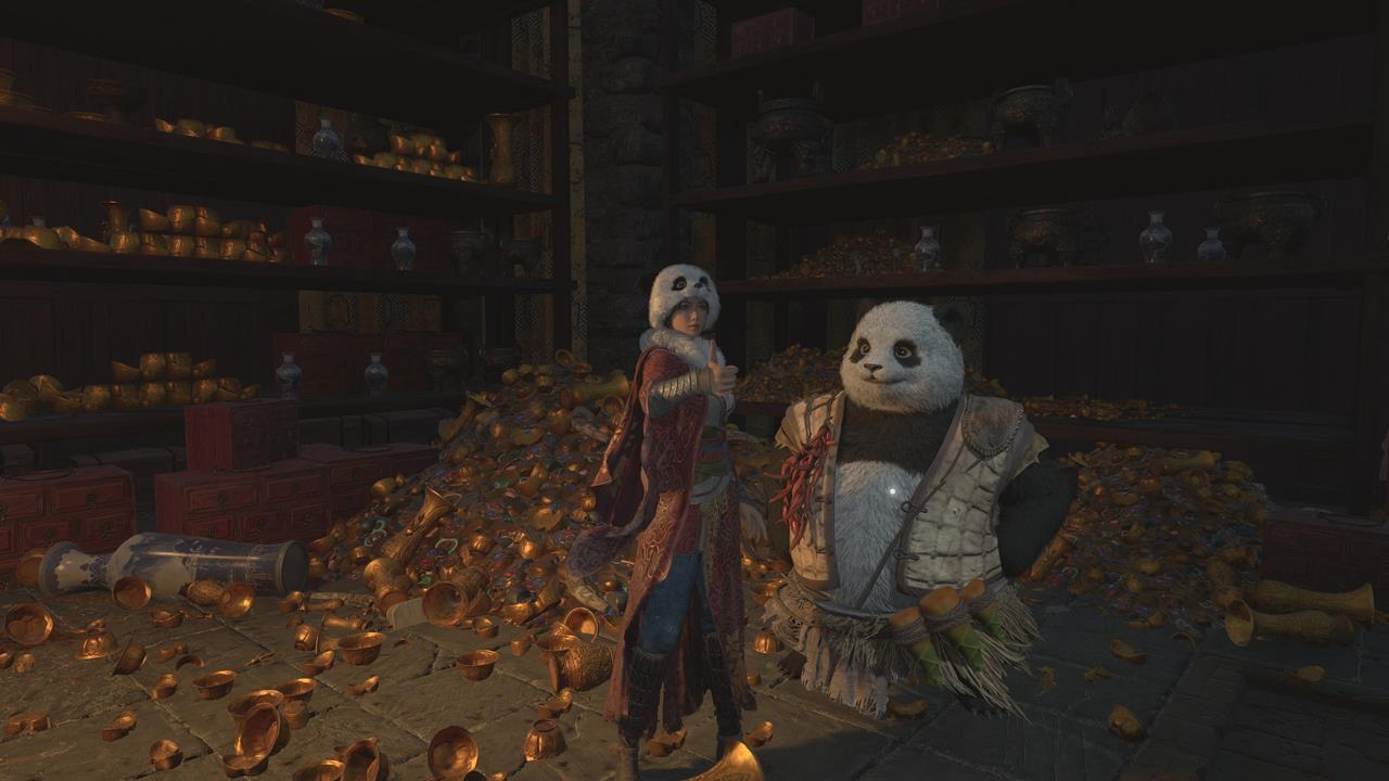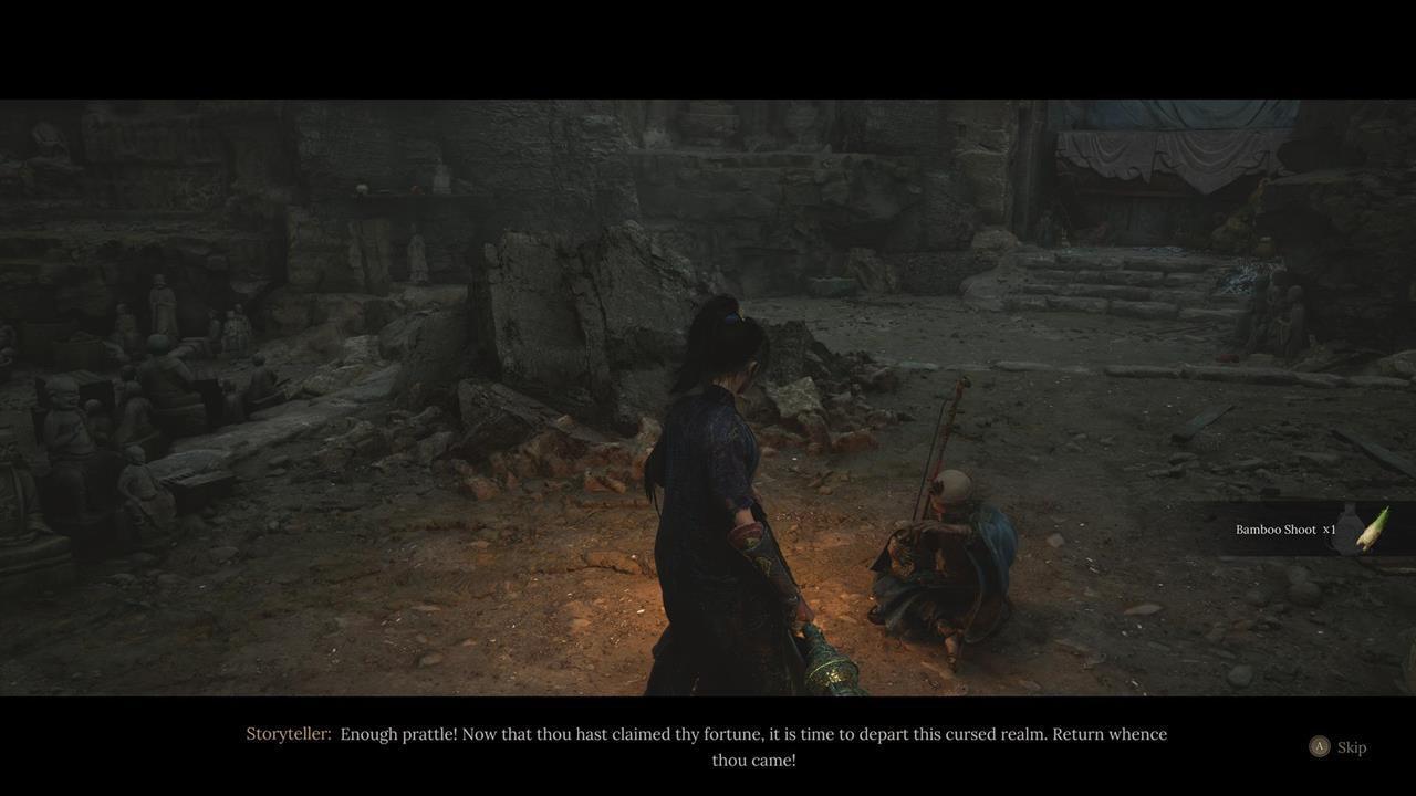 От предыдущего монстра следуйте по мосту через реку. Добравшись до лестницы, сверните к дому справа. Пройдите мимо него по прямой вдоль реки. Не переходите каменный мост справа, а следуя прямо. У входа в пещеру появится бамбуковый монстр. Если он убежит, прыгните в реку, чтобы возродиться у святилища. В этой же пещере вы встретите Рассказчика и торговца Панду, которому можно обменивать бамбуковые ростки. Позже он появится и в других местах.
