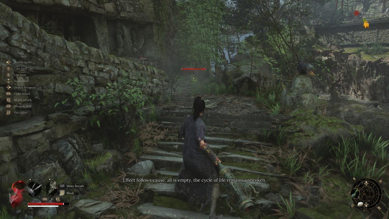 Пройдите по главной тропе до места, где можно сбросить лестницу к святилищу. После большого птицеподобного врага идите по тропе вверх — найдете золотую птицу и гнездо с предметом. Как только подберете предмет, свалитесь на нижний уровень — там и будет бамбуковый монстра. Используйте заклинание.