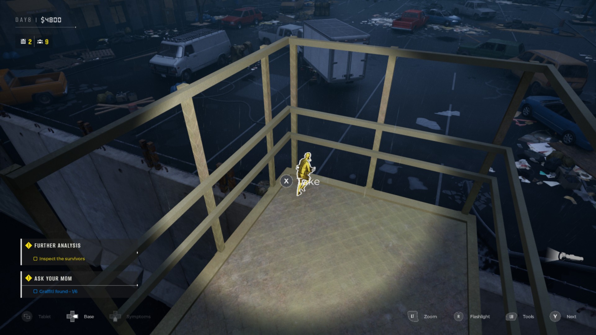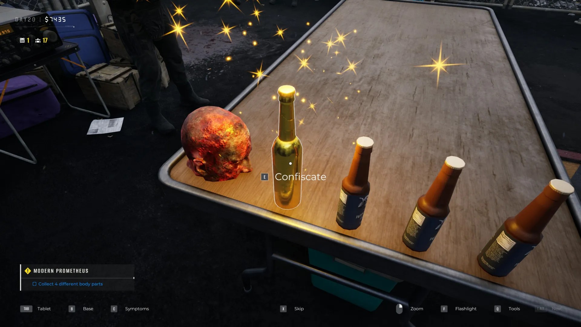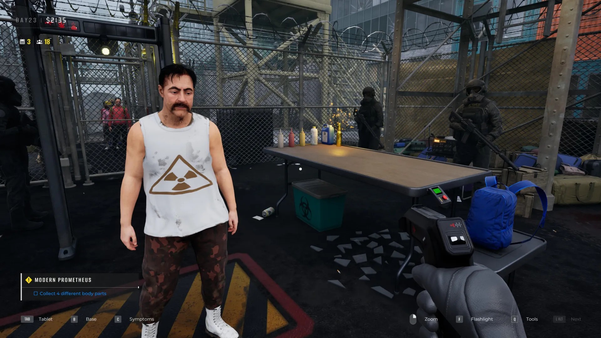 Также был случай, когда выживший пришел с рюкзаком, набитым пивом, золотой бутылкой… и человеческой головой. Это запускает небольшой побочный квест на сбор четырех частей тела. Мне этот персонаж встретился на 20-й день. Речь идет о квесте «Современный Прометей».
