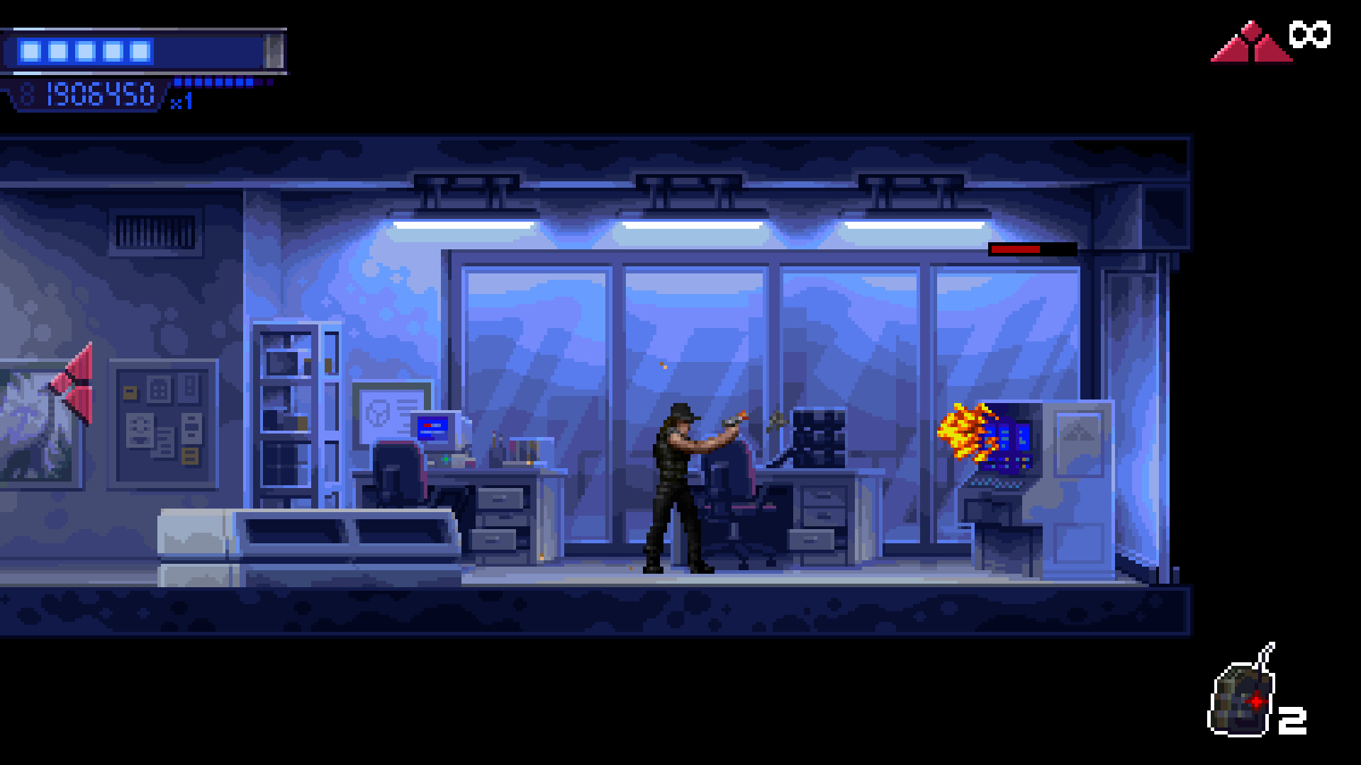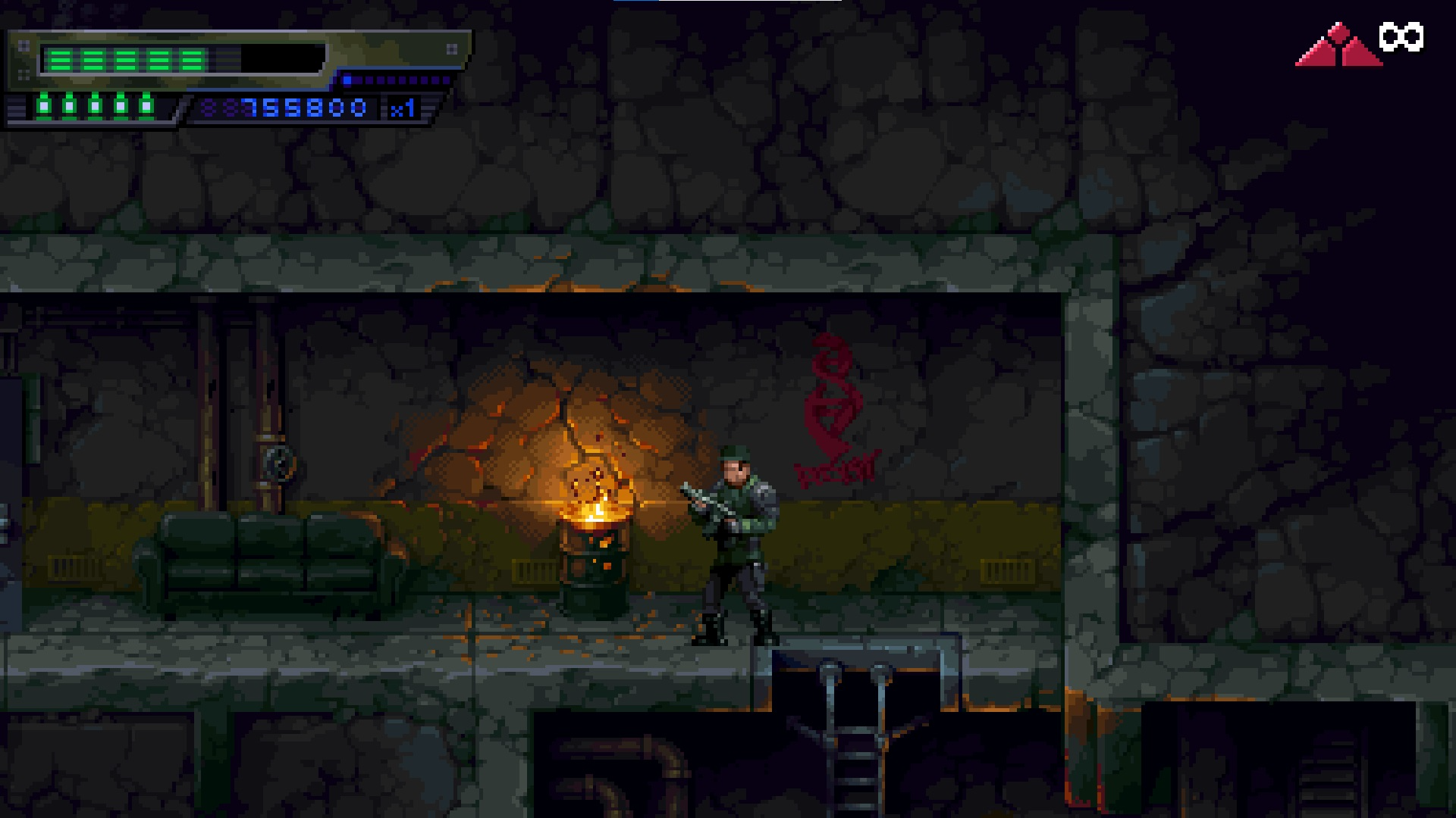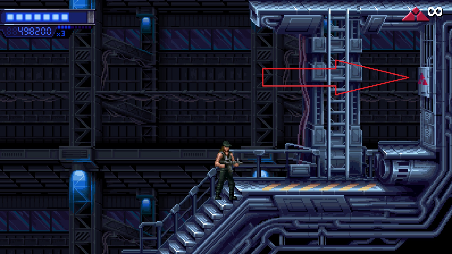 После первого мини-босса спуститесь вниз по лестницам, продолжая уничтожать врагов. Терминаторы будут появляться из специальных ниш, при этом вы также сможете использовать эти ниши, чтобы прятаться от них. На самом нижнем уровне идите вправо. Вам нужно запрыгнуть вверх по трупе, но вы пройдите за каменную стену с правой стороны, чтобы отыскать секрет — продолжение СКАЙНЕТ (4/12).