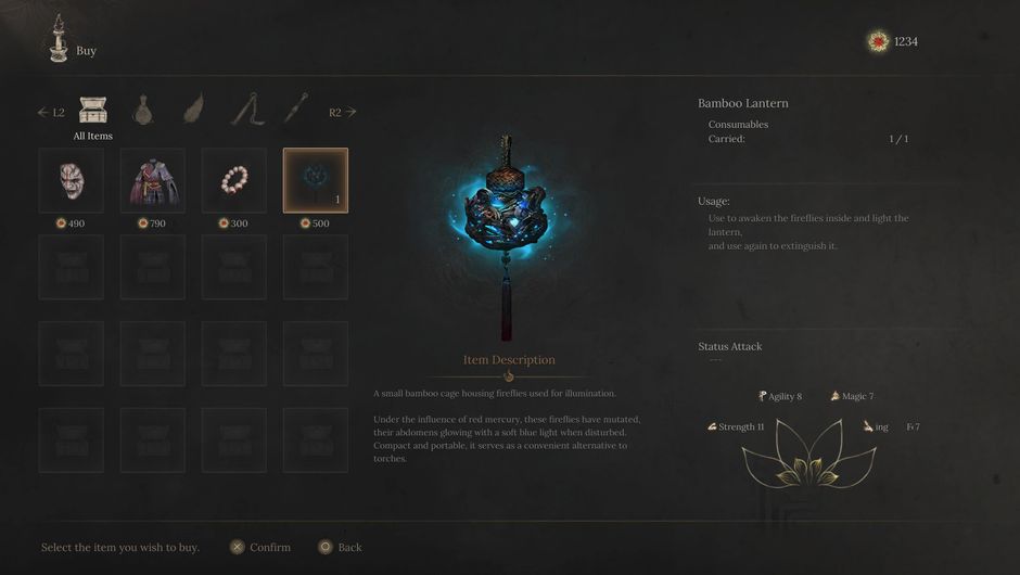 Получив фонарь, откройте меню снаряжения и перейдите в раздел «Предметы» в нижней части экрана. Выберите любой свободный слот и поместите в него бамбуковый фонарь. Прямо во время игры нажмите на стрелку «вверх» или «вниз» на крестовине, чтобы выбрать фонарь, а затем — на кнопку X (на контроллере PlayStation), чтобы его включить.