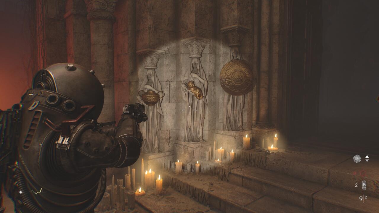Вернитесь в соседнюю комнату и сохранитесь. Восполните здоровье, скрафтите/купите ремкомплекты, пополните боезапас. Крафтить в первую очередь нужно медикаменты, а не патроны. В церкви вас ждет битва с боссом, и во время сражения монстр будет постоянно призывать обычных мобов, с которых будут выпадать те самые боеприпасы. Ваша главная задача — обеспечить выживание персонажа, то есть поддерживать здоровье на максимуме.