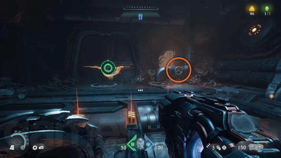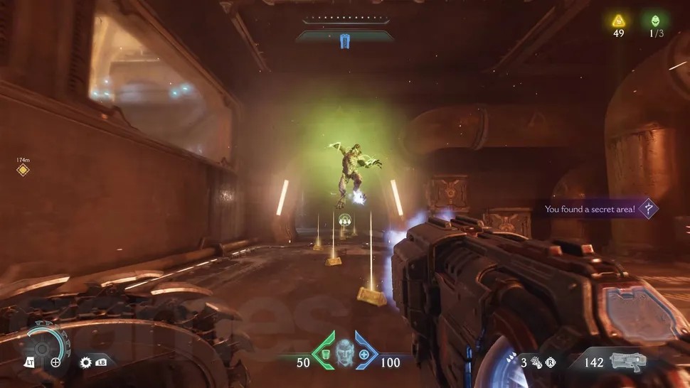 Внутри вас ждут не самые выдающиеся награды — 9 золотых слитков и 1 сигил жизни. Но, как отмечалось ранее в наших советах по DOOM: The Dark Ages, золото требуется для улучшения оружия, а сигилы жизни повысят выживаемость Палача. Единственная угроза — адский рыцарь, который выломает стену. После того как справитесь с ним, идите в конец коридора, разбейте щитом раскаленный замок и сможете покинуть зону, завершив уровень Гебет.