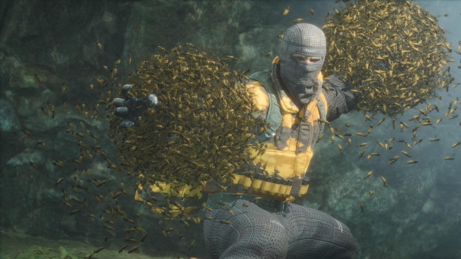 Когда у босса останется половина здоровья или выносливости, запустится кат-сцена: Боль снимет маску и выпустит пчелиные пули. Такие пчелы отличаются от обычных — они оставляют за собой красный след и летят намного быстрее. Во время такой атаки ныряйте в воду и оставайтесь под ней до тех пор, пока насекомые не разлетятся. Если пчела заденет Снейка, то застрянет в его теле и урежет наполовину урежет общий запас здоровья. Чтобы от нее избавиться, придется зайти в меню «Лечение» и извлечь пчелу вручную.