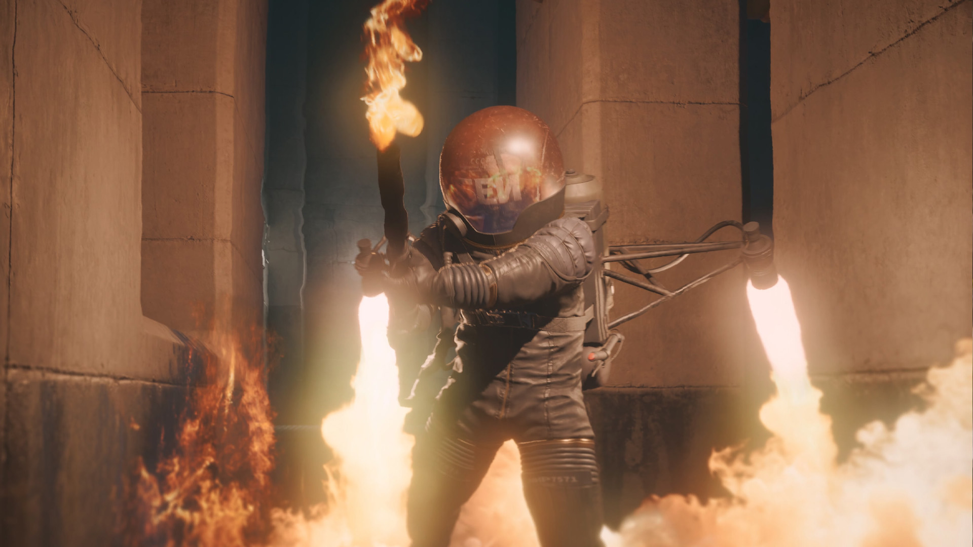 При каждом использовании огнемета пламя остается на полу и стенах, сужая пространство боя. Вы можете его затушить: посмотрите вверх — на стенах есть красные трубы. Выстрелите, чтобы облить пространство водой, которая потушит огонь внизу (точно так же можно тушить Снейка). Если герой загорится, можно воспользоваться этими трубами или выполнить несколько перекатов. В южной части карты можно повиснуть на краю арены, чтобы избежать некоторых атак босса.