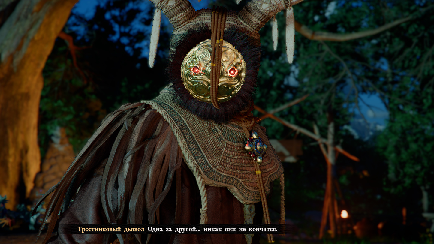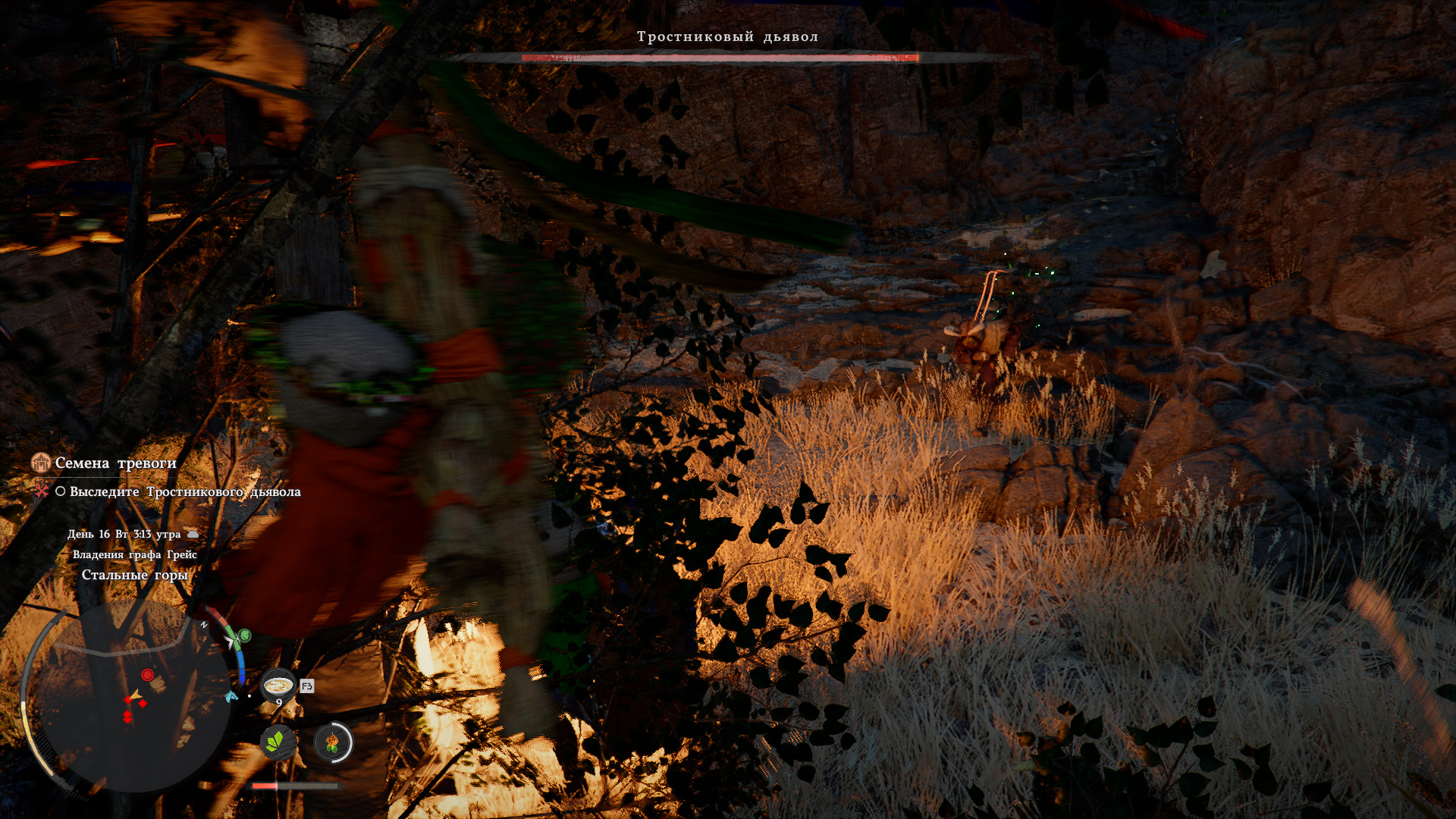 После встречи с Наирой вам нужно выследить Тростникового дьявола. Зажмите CTRL снаружи, чтобы увидеть желтую линию, а затем двигайтесь за Тростниковым дьяволом. Вскоре начнется первое сражение.