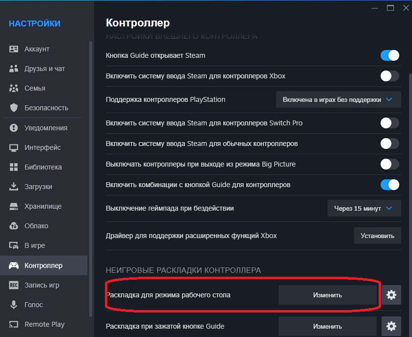 Для начала подключите DualSense к компьютеру через провод или Bluetooth, как описано выше. Затем откройте Steam и перейдите в «Настройки», «Контроллер». В этом разделе можно нажать «Раскладка для режима рабочего стола», чтобы проверить и настроить привязку кнопок.
