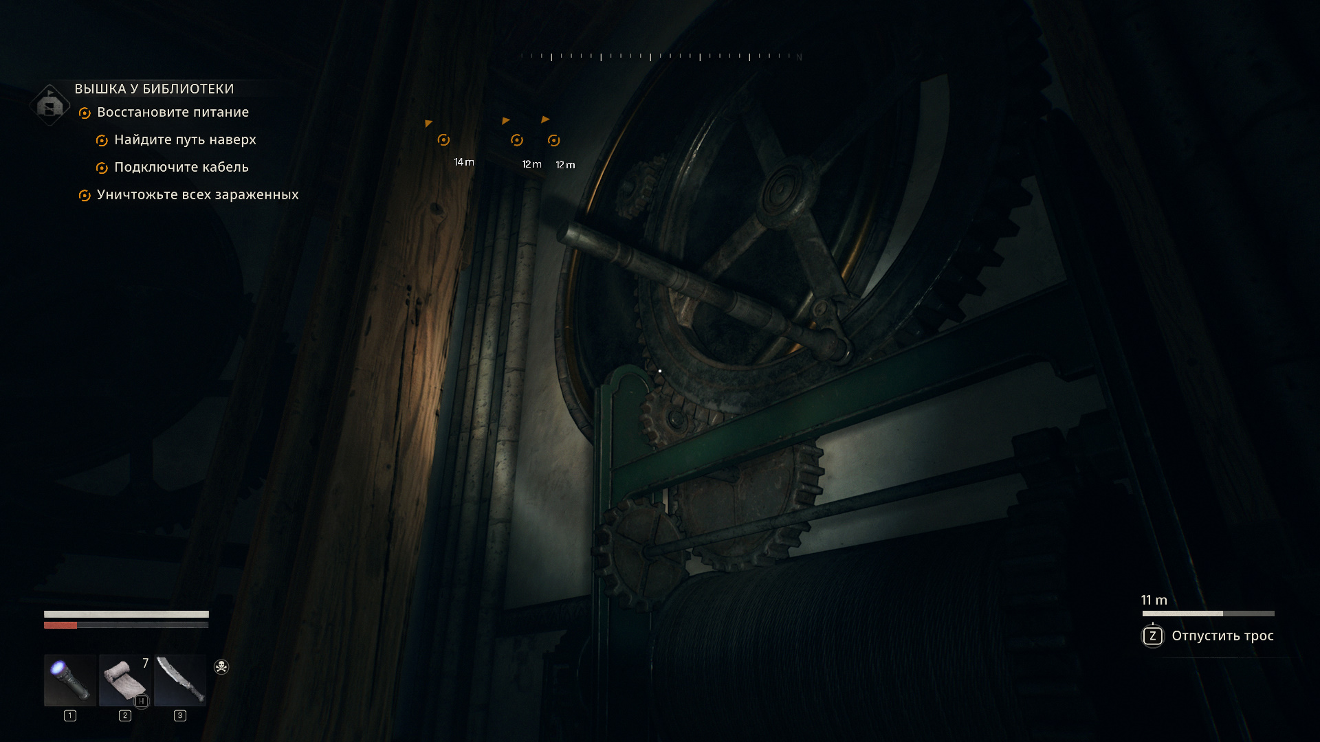 Как только запустите генератор, сможете взять кабель. Сначала подключите его к одному из трех щитков на том же уровне, чтобы началась вращаться шестерня с перекладиной, за которую может зацепиться Крейн.