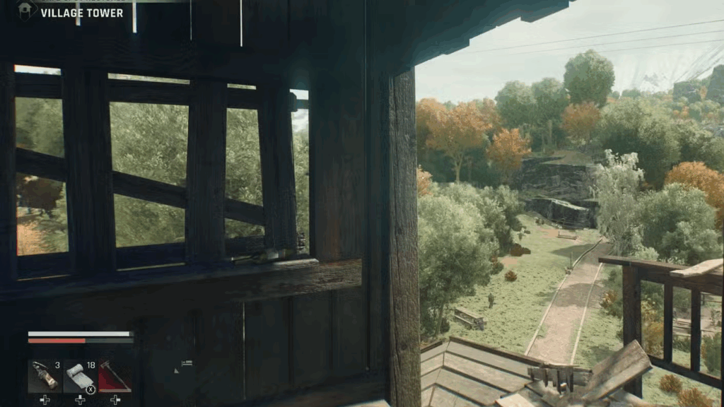 Найдите доски на дереве рядом с вышкой, заберитесь по ним, используя прыжки. Посмотрите вправо и запрыгните на вышку.