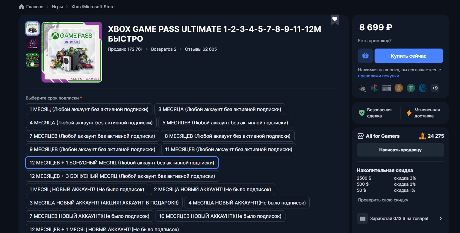 Некоторые платформы и продавцы предлагают услуги по активации Game Pass что называется «под ключ». Они используют свои способы обхода региональных ограничений. К популярным площадкам можно отнести ту же платформу Plati.Market. Зачастую продавцы просят создать аккаунт в нужной стране (США, Турция, Индия и так далее), после чего уже можно активировать подписку.