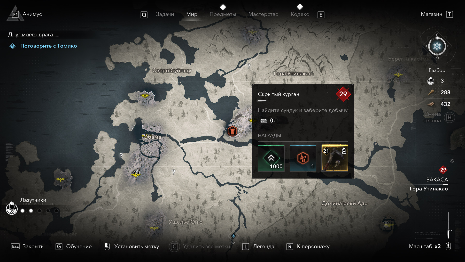 Следующая гробница расположена в регионе 29-го уровня Вакаса, что на северо-востоке игрового мира. Ищите суб-регион «Гора Утинакао». К юго-западу от надписи есть точка синхронизации «Вид на Сандзёга-такэ». Перемещайтесь к ней и следуйте к ближайшему «вопросительному знаку» на запад. Ориентируйтесь по скриншоту ниже.