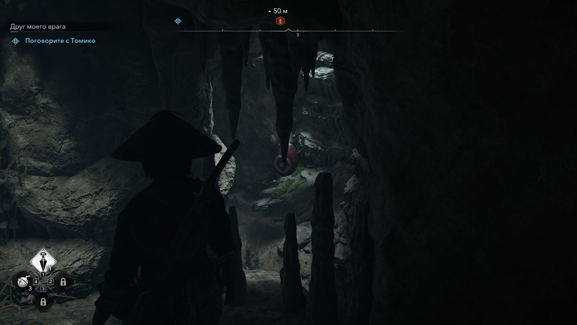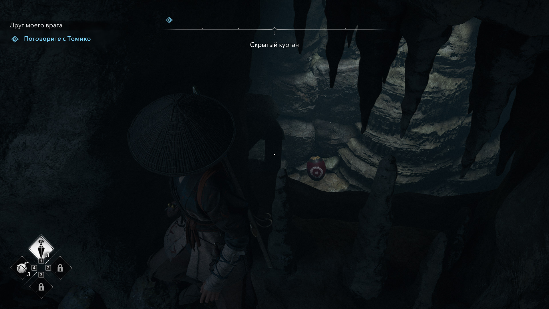 Немного подождите, поскольку враги чуть дальше теперь встревожены. В штольне с легендарным сундуком есть три противника. Мой уровень был ниже. В таком случае в настройках игры включите легкий стелс (то есть Наоэ в стелс режиме может бесшумно убить любого противника, даже босса, независимо от уровня), и ликвидируйте цели. Если вас заметили, просто запрыгните на выступ выше (предварительно метните кунаи в красный горшок) и спрячьтесь. Когда враги успокоятся, вы сможете вновь использовать против них скрытные убийства.