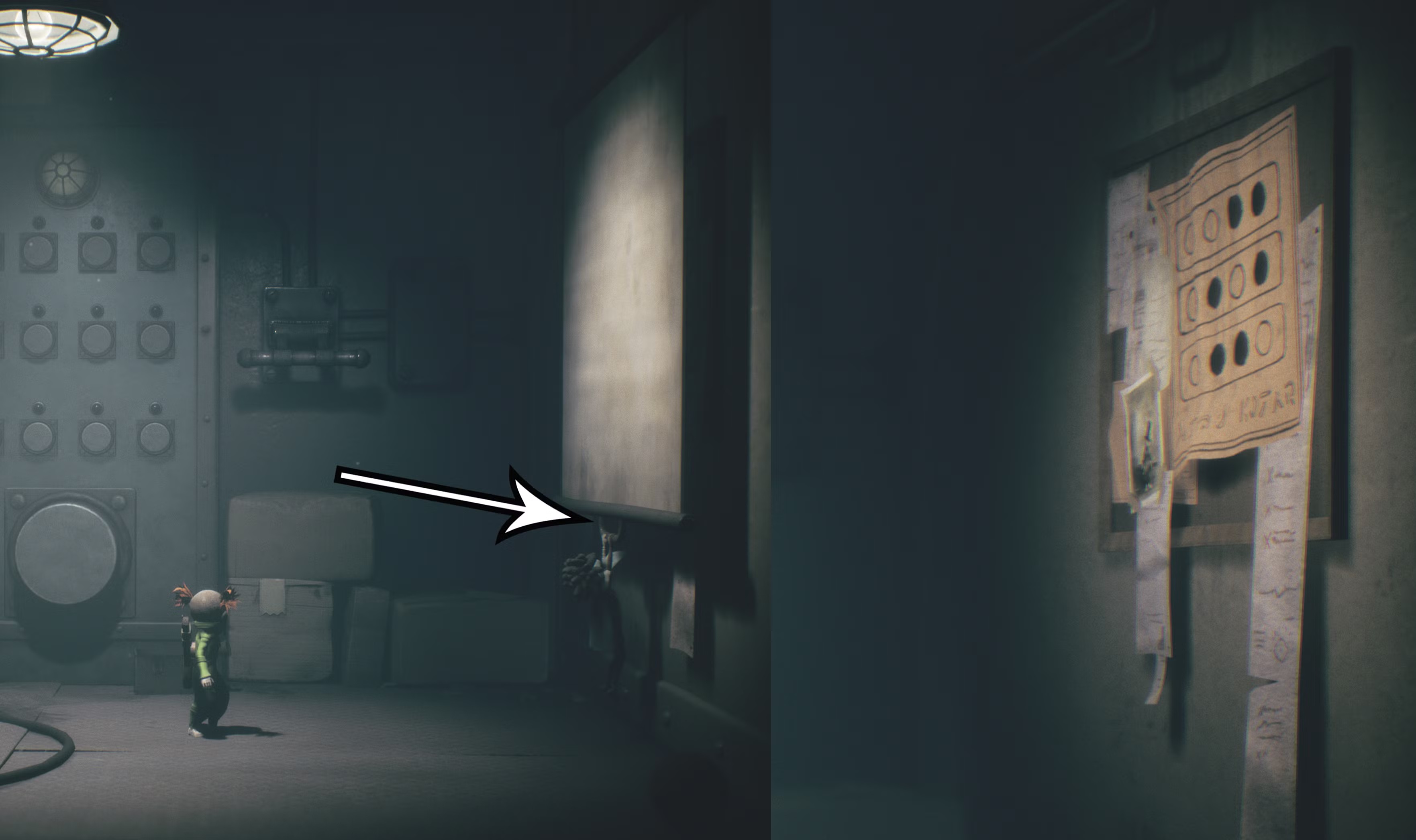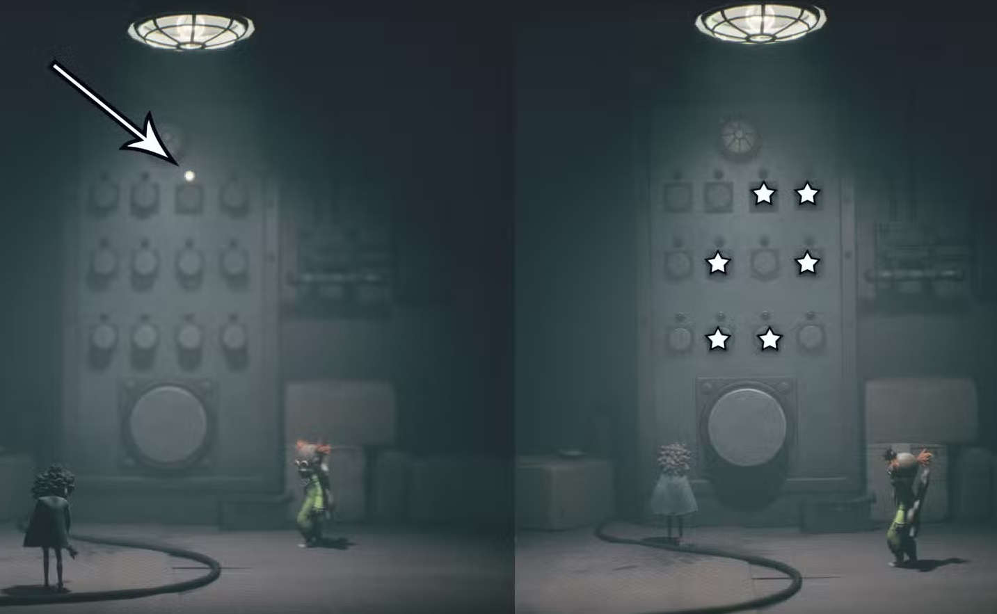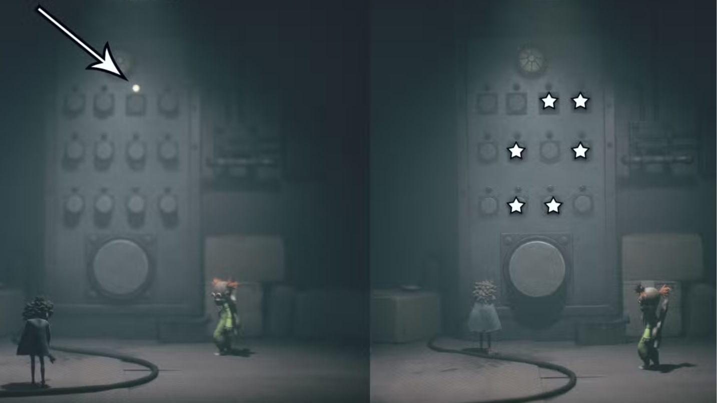 На левой части изображения ниже показан правильный момент, когда нужно стрелять в третью сверху вниз и слева направо кнопку. Правая часть изображения ниже демонстрирует все кнопки, которые нужно активировать таким образом, что позволит решить загадку с кнопками в Little Nightmares 3.