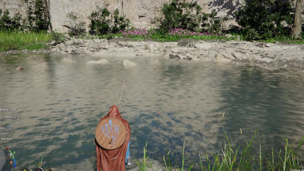 - Далее важно стоять около водоема, чтобы появилась подсказка о рыбалке. Щелкните ЛКМ, чтобы запросить удочку. Не обращайте внимание на подсказку «Управление». Эта функция связана с перемещением поплавка по водоему до того, как рыба окажется на крючке. Ничего не жмите, просто ждите.