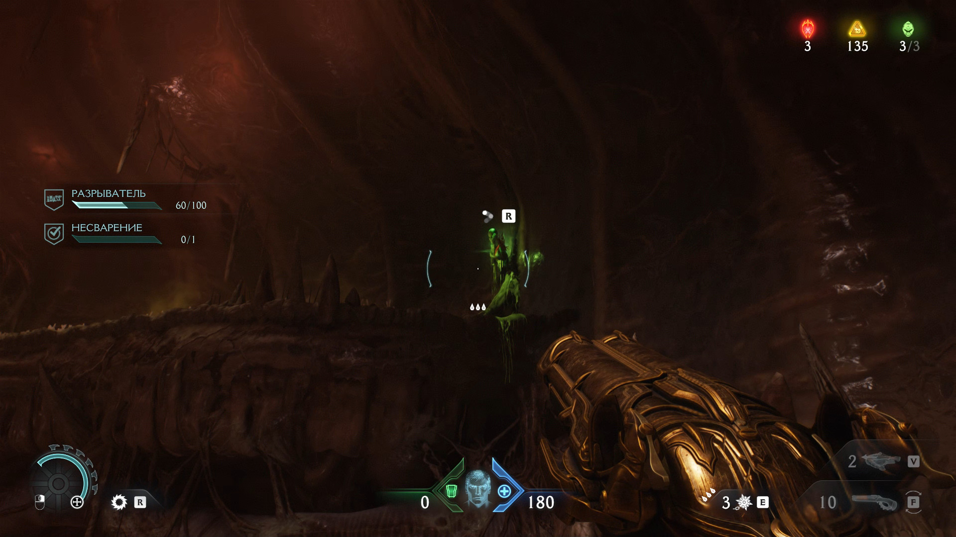 Продолжите путь по сюжету и разрушьте второй узел органа. Не спешите прыгать вниз. Сверху есть платформа с секретной областью и сундуком. Метните щит в зеленую плоть и притянитесь.