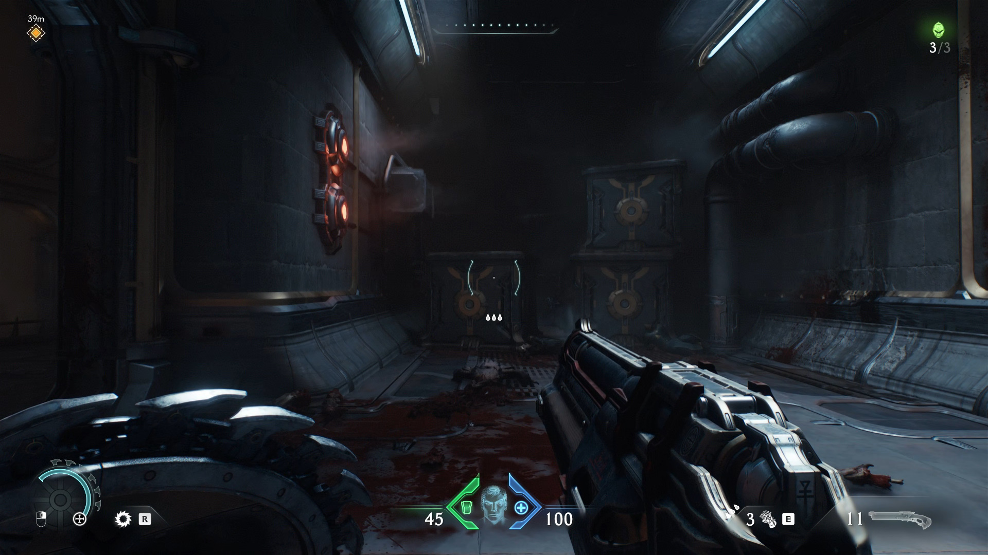 Как только выйдите из здания и вернетесь через дверь путем взаимодействия с первым терминалом, спрыгните вниз, убейте демонов и войдите в коридор с цепями.