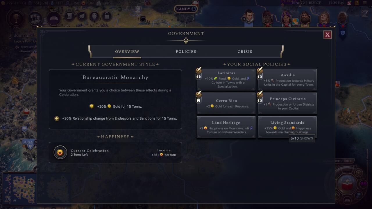 Этот прирост может быть фиксированным за каждый ход или зависеть от определенных условий. Однако всегда стоит учитывать, что выбор социальной политики — это компромисс, и иногда могут быть более выгодными другие бонусы. К счастью, политики можно менять в любое время.