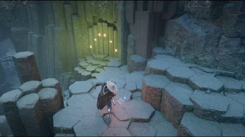 Каждый проход ведет в небольшую нишу, где находится большой блок с символом. Используйте «Удар пальмары», чтобы обнаружить выгравированный камень. Собрав все три выгравированных камня, перейдите на другую сторону лабиринта Древнего разлома — к области поиска с «вопросительным знаком». Поместите 3 камня в отверстия, чтобы появился Камень Бездны.