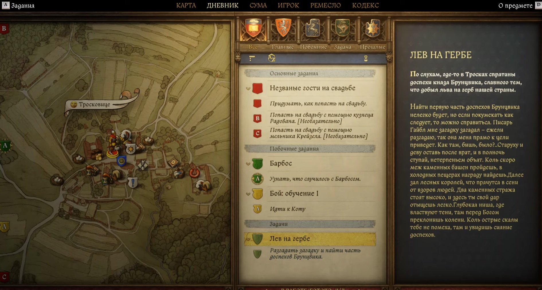 Для того чтобы приступить к выполнению задания «Лев на гербе», нужно завершить вступительную часть игры, пока вы не сможете свободно перемещаться по игровому миру (после того как завершится наказание Индро и Птачека в Тросковице).