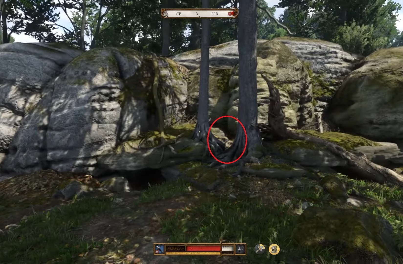 К северу от этого перекрестка в лесу находится логово волков. Поблизости стоят два высоких дерева. Разобравшись с волками, осмотрите пространство между двумя небольшими деревьями, растущими над логовом.