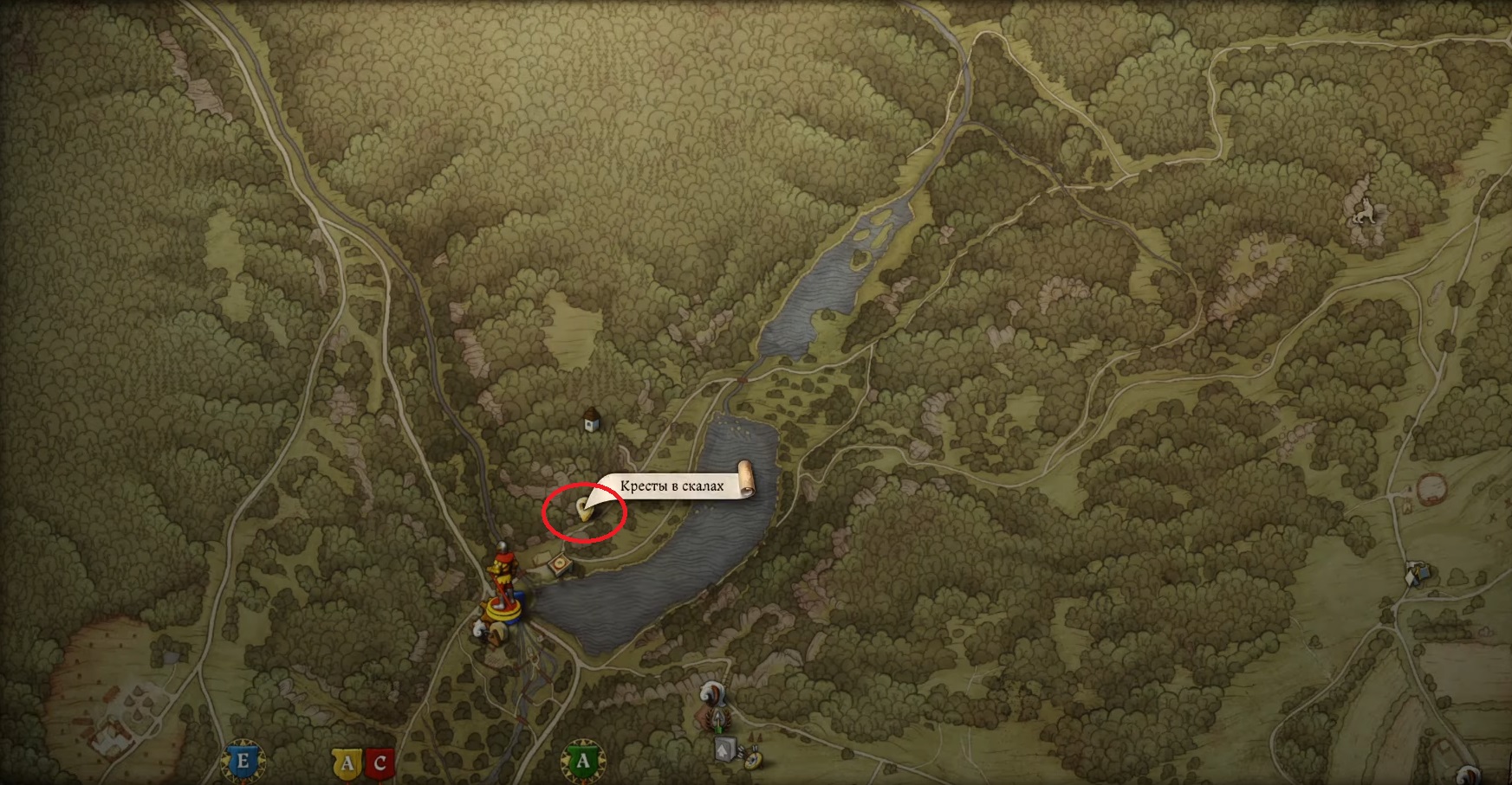 - «Там перед Богом преклонишь колени». Пройдя между этими скалами, вы найдете заброшенную часовню в пещере. На небольшом валуне перед часовней стоит каменный крест. Если сдвинуть его, появится место, где вы сможете применить лопату.