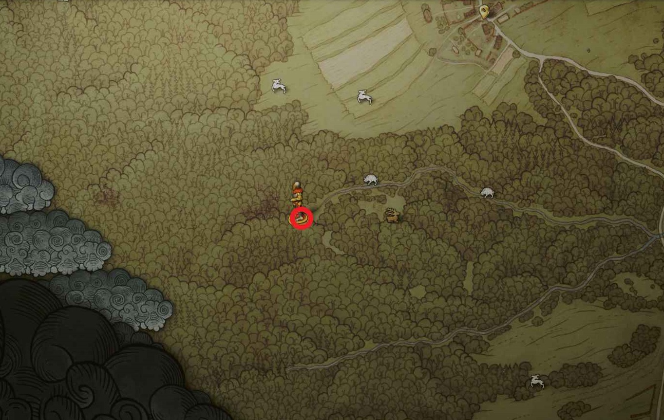 Перемещайтесь в лагерь лесорубов. На карте появится огромная область поиска, так что вам придется вспомнить описание пути, по которому прошел лесоруб Вашек. От лагеря лесорубов двигайтесь по дороге на юго-запад, пока не попадете на перекресток с ручьем, как показано на скриншоте.