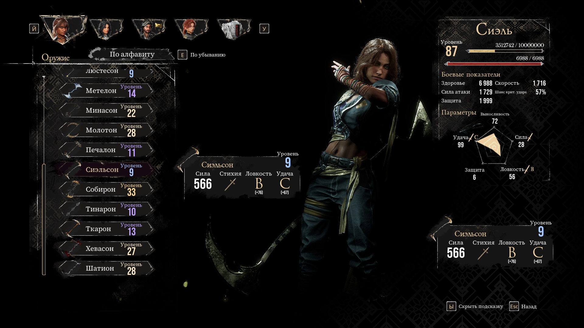 Сиэльсон — стартовое оружие Сиэль и ее лучшее снаряжение в начале игры благодаря усилению от параметров Ловкости (B) и Удачи (C), которые являются ее основными характеристиками. Несмотря на отсутствие пассивных умений, его высокая сила и хорошая масштабируемость полностью компенсируют данный недостаток. Да и девушка появляется ближе к концу первого акта, так что лучше дождаться начала второго и перейти…