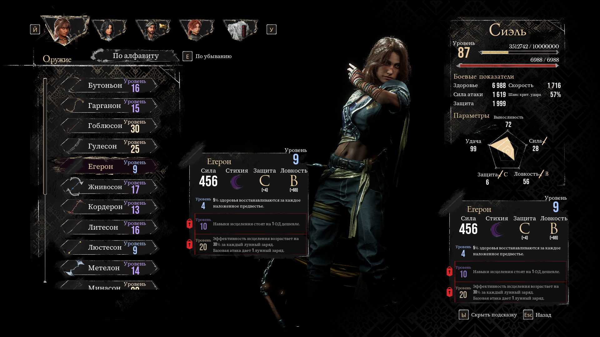 Во втором акте стоит заменить оружие Сиэль на Егерон— оно повышает ее выживаемость благодаря пассивному навыку 4-го уровня, а при достижении 10-го уровня снижает стоимость умений на исцеление. Это делает Сиэль более эффективным персонажем поддержки, при этом она сохраняет способность наносить высокий урон.