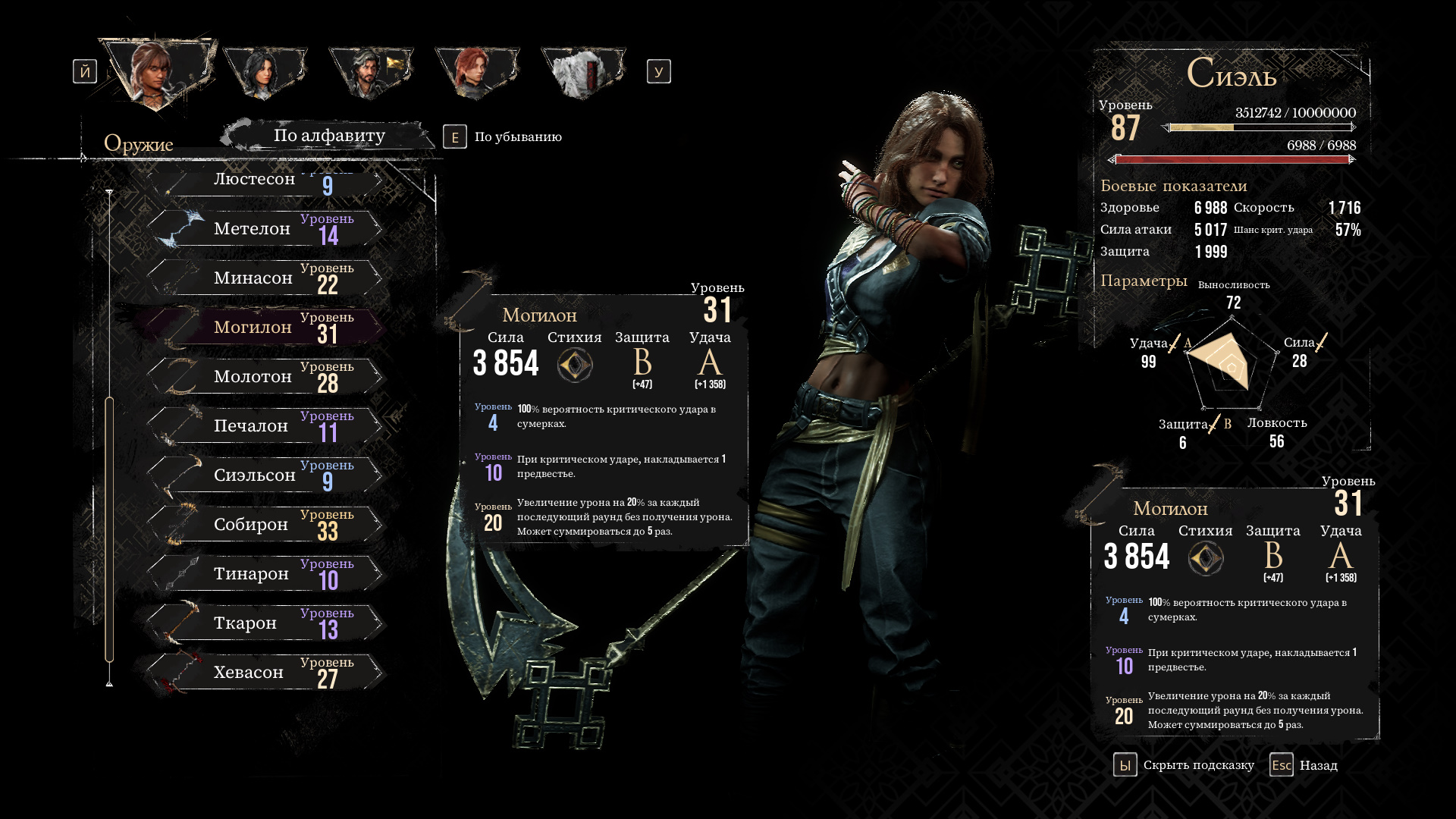 В третьем акте Могилон становится лучшим оружием для Сиэль: оно увеличивает наносимый урон и делает эффект предвестий более стабильным благодаря гарантированным критическим ударам в сумерках.