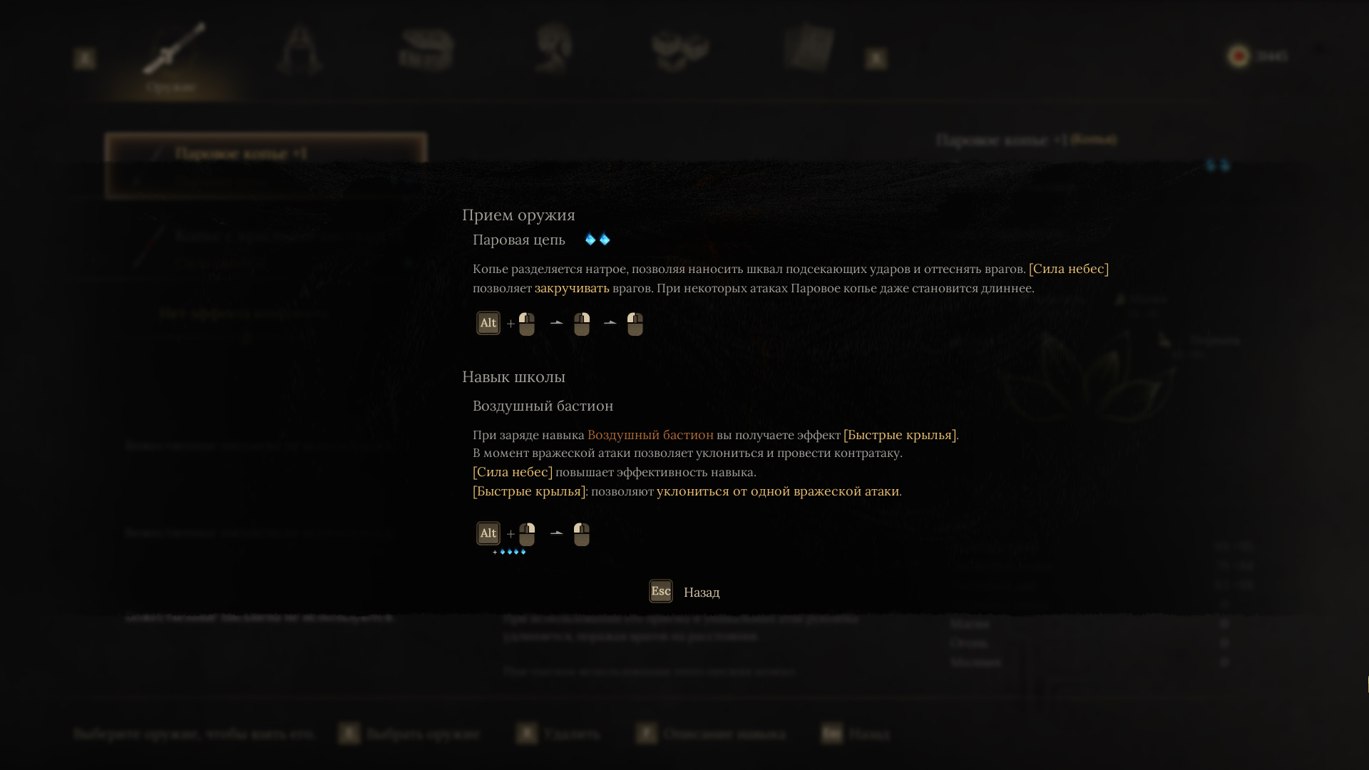 - Навык по умолчанию: «Паровая цепь» — копье делится на три части и наносит быструю серию ударов. При усилении Силой небес враг начинает вращаться. Некоторые удары также временно увеличивают длину копья.