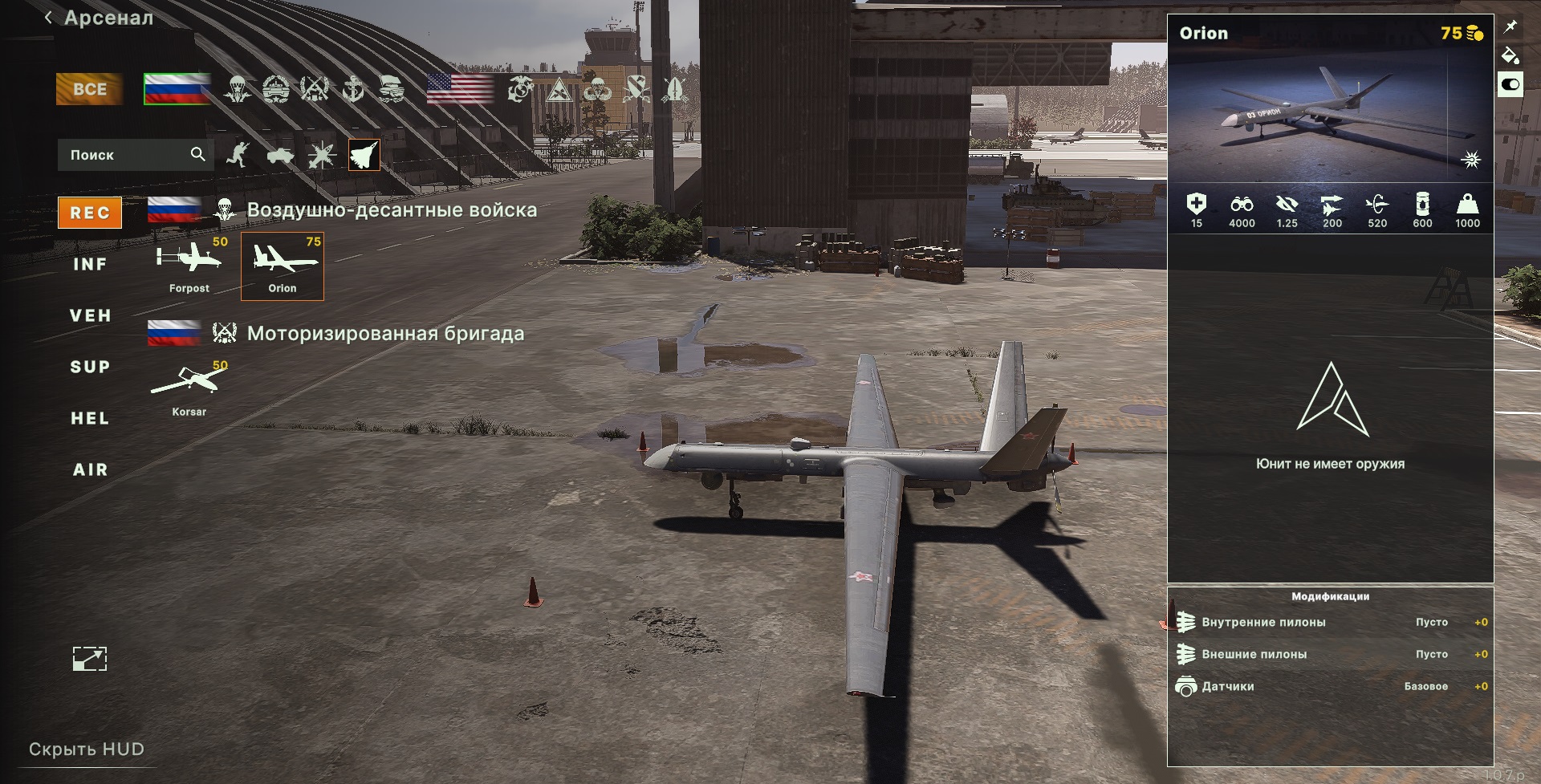 Несмотря на то, что вы можете дополнительно оснастить любой российский дрон оружием, сейчас мы рассматриваем лучшие разведывательные юниты, так что ставим перед БПЛА две задачи — разведку и лазерное наведение. В этом плане «Орион» превосходит любые аналоги. Происходит это благодаря куда большей дальности обзора. Убедитесь, что в воздухе на постоянной основе есть хотя бы один «Орион»: благодаря этому противник не сможет утаить от вас ни одного коварного плана.