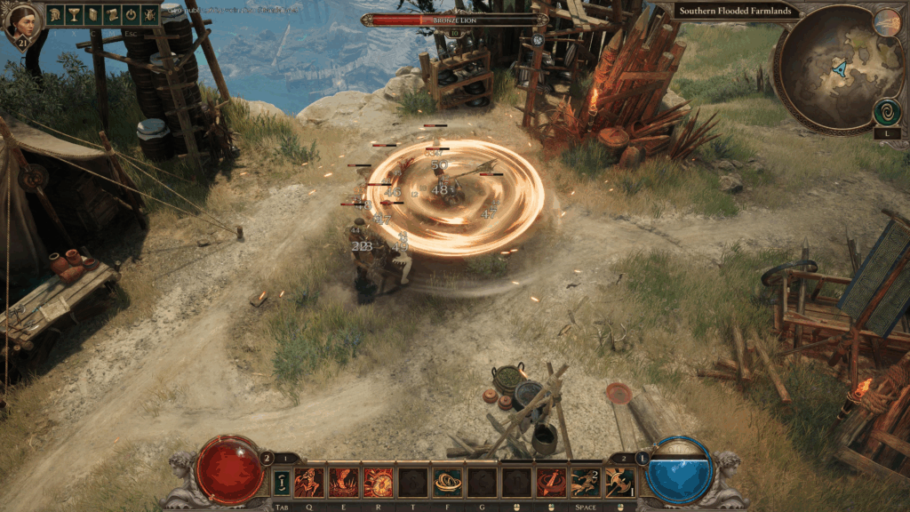 В качестве основного источника урона используется навык «Стремительный удар» с модификатором «Вихрь». Для его усиления используются ветки Военное дело (Война) и Шторм. В самом начале «Стремительный удар» может показаться крайне слабым, но совсем скоро вы сможете прокачать его мощь. Как и в других ARPG, такой билд с вихрем очень прост в освоении, что делает его отличным выбором для новичков.