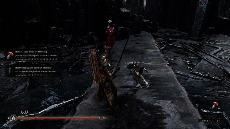 Перейдите через мост, за которым встретите нового противника. Эти рыцари опасны тем, что могут раз за разом толкать вас своим мощным щитом. Постарайтесь не попасть под него. После убийства противника двигайтесь вниз по винтовой лестнице. Спустившись вниз, обратите внимание на два прохода. Один из них ведет в комнату с рыцарем. Зачистите ее и достаньте из сундука лучезарное зимнее стекло. Оно необходимо для еще одного улучшения клинка Великомученика.