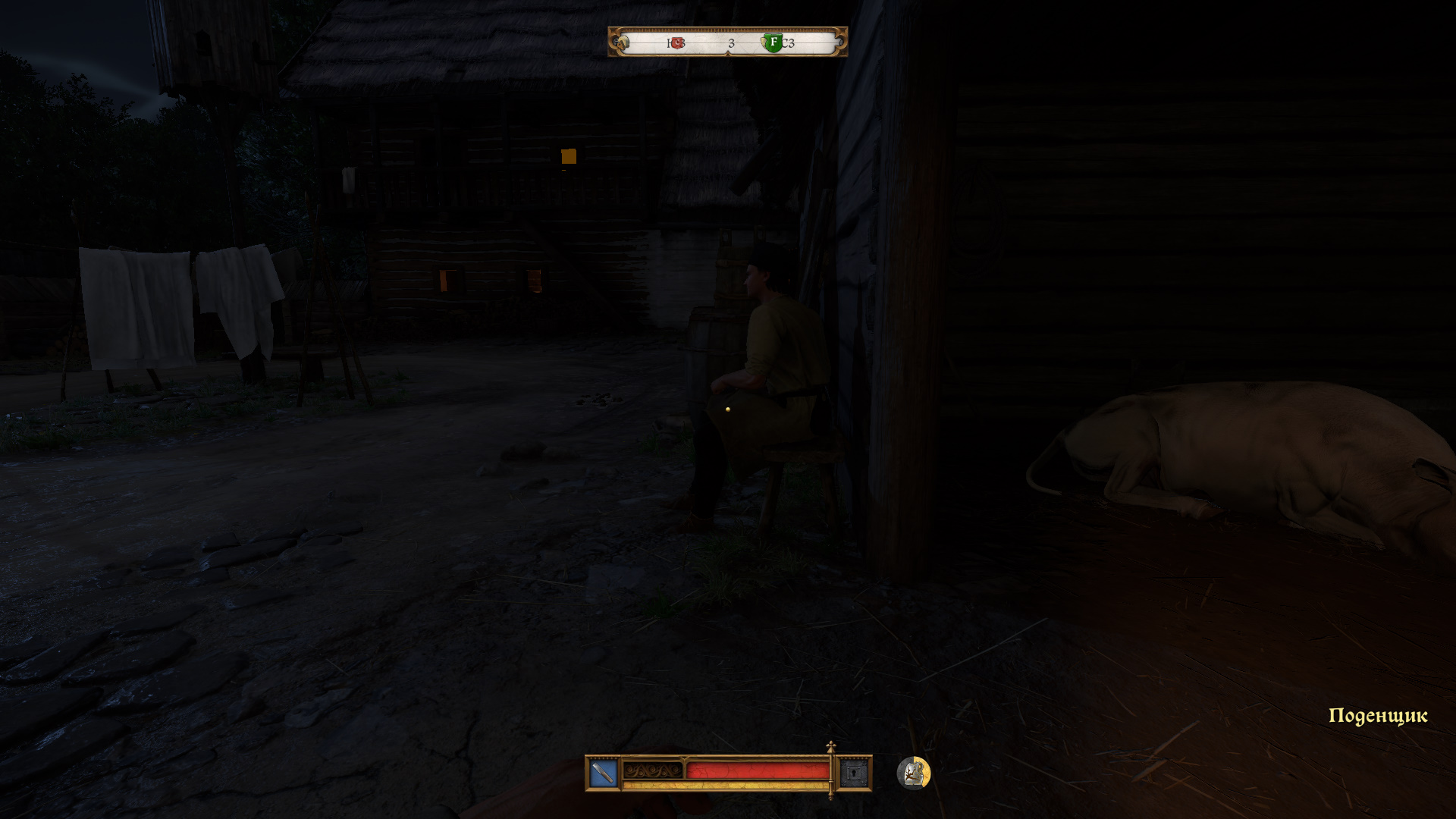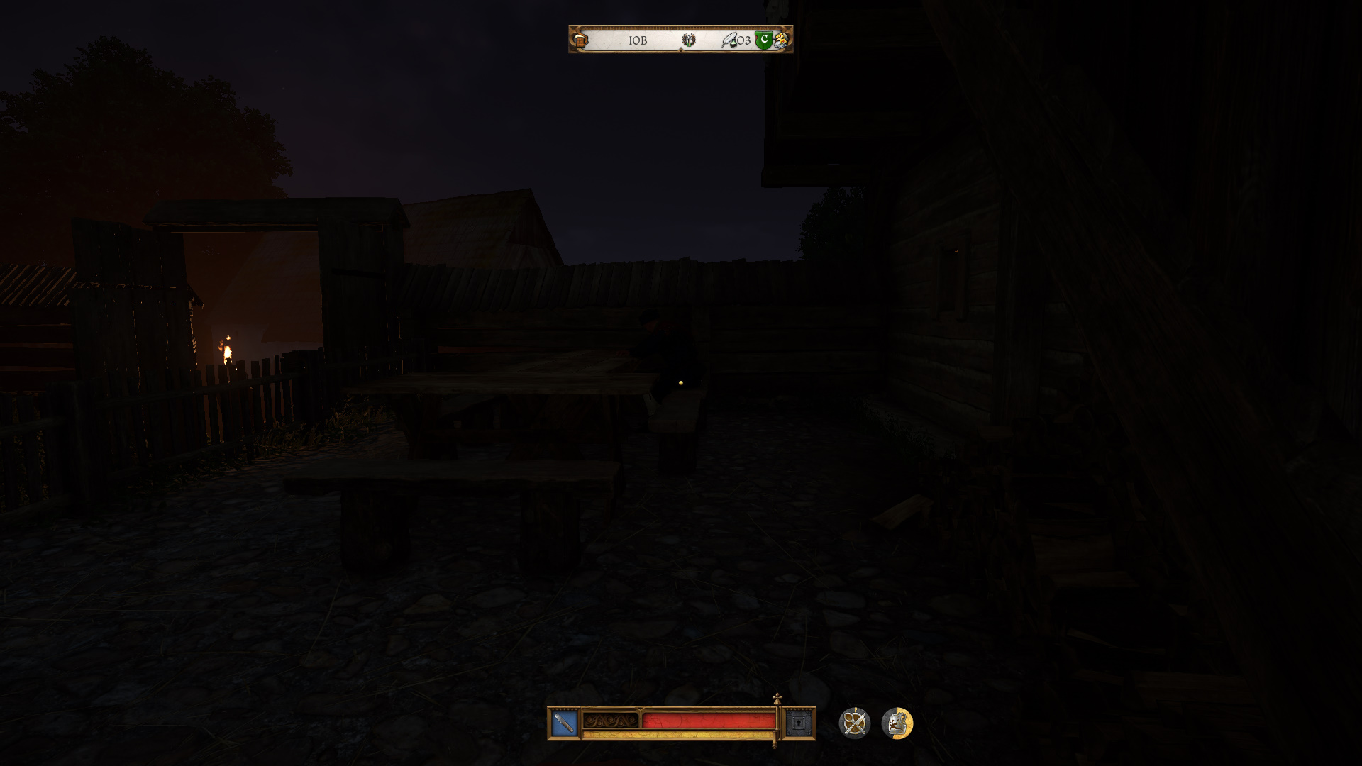 Обойдите сарай. Рядом сидит охранник. Подкрадитесь к нему без факела с дальней стороны, пригнувшись, и он вас, скорее всего, даже не заметит. Проберитесь внутрь сарая и взаимодействуйте с быком.