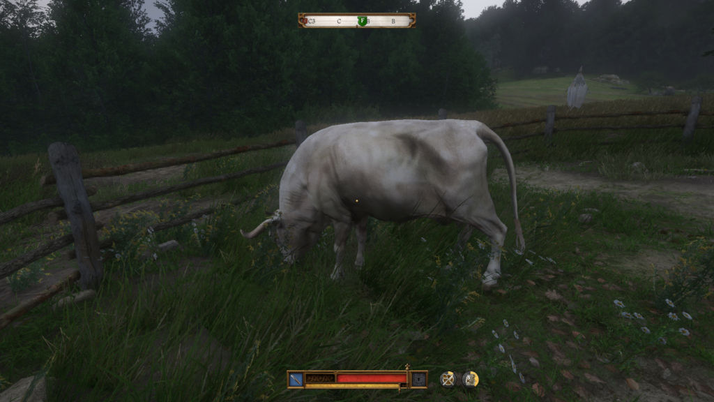 Обойдите сарай. Рядом сидит охранник. Подкрадитесь к нему без факела с дальней стороны, пригнувшись, и он вас, скорее всего, даже не заметит. Проберитесь внутрь сарая и взаимодействуйте с быком.