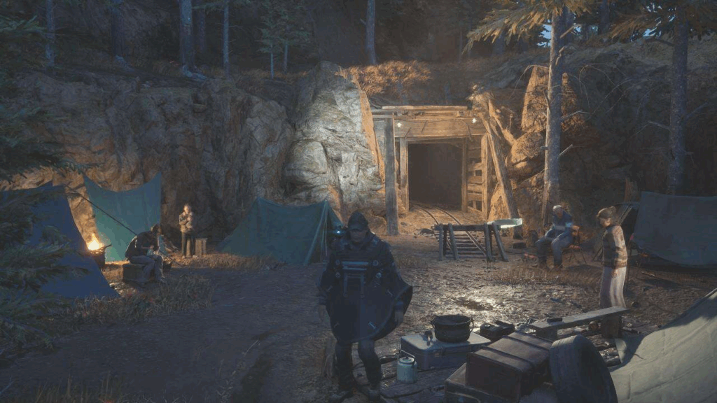 Справа от нее есть тропинка, уходящая в горы. Идите по ней, убивая врагов, поднимитесь по длинной лестнице и попадете в лагерь выживших перед входом в другую шахту.